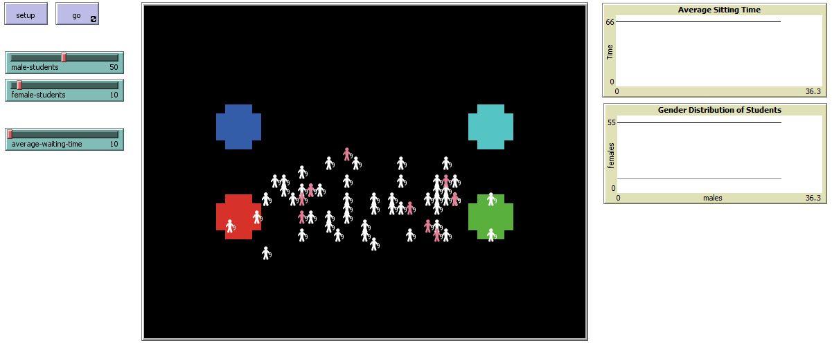 breed [males male] breed [females female] males-own [cafe-time status] females-own [cafe-time status] globals [counter] to setup clear-all setup-cafeteria reset-ticks end to setup-cafeteria make-tables make-students set counter 0 end to make-tables ask patch (-0.6 * max-pxcor) 5 [ ask patches with [ distance myself < 2.5 ] [ set pcolor blue ] ] ask patch (0.6 * max-pxcor) 5 [ ask patches with [ distance myself < 2.5 ] [ set pcolor cyan ] ] ask patch (-0.6 * max-pxcor) -5 [ ask patches with [ distance myself < 2.5 ] [ set pcolor red ] ] ask patch (0.6 * max-pxcor) -5 [ ask patches with [ distance myself < 2.5 ] [ set pcolor green ] ] end to make-students create-ordered-males male-students [ set shape "person" set color white move-same-students ] create-ordered-females female-students [ set shape "person" set color pink move-same-students ] end to move-same-students set size 1.5 set heading 0 setxy (10 + random -22) min-pycor set cafe-time average-waiting-time set status 0 end to go ask males [ if pycor != 12 [ move-students ] ] ask females [ if pycor != 12 [ move-students ] ] tick end to move-students if (ticks mod 60 = 0) [ set cafe-time (cafe-time - 1) ] if (cafe-time = 0) [ die ] if counter = 0 [ if(status = 0) [ move-to patch -12 -5 set status 1 set counter counter + 1 ] ] if counter = 1 [ if(status = 0) [ move-to patch -15 -6 set status 1 set counter counter + 1 ] ] if counter = 2 [ if(status = 0) [ move-to patch 14 -3 set status 1 set counter counter + 1 ] ] if counter = 3 [ if(status = 0) [ move-to patch 14 -7 set status 1 set counter counter + 1 ] ] if (status = 0) [ fd random 2 ] set label cafe-time end