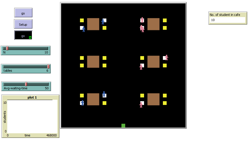 breed [persons person] breed [waiters waiter] persons-own[ time_to_leave] patches-own[student-on-table] globals [ available tablem-x tablem-y tablef-x tablef-y ] to setup clear-all open-door set-tables set-chairs student-come set available 0 reset-ticks end to open-door ask patches with [ pxcor = 16 and pycor = 0] [ set pcolor green ] end to set-tables let table 1 set tablem-x 8 + min-pxcor set tablem-y 7 set tablef-x 24 + min-pxcor set tablef-y 7 while [table < tables ] [ ask patch tablem-x tablem-y [ set pcolor brown set table table + 1 set tablem-y tablem-y + 10 ] ask patch tablef-x tablef-y [ set pcolor brown set table table + 1 set tablef-y tablef-y + 10 ] ] end to set-chairs ask patch 5 28[ set pcolor yellow ] ask patch 5 26[ set pcolor yellow ] ask patch 5 18[ set pcolor yellow ] ask patch 5 16[ set pcolor yellow ] ask patch 5 8[ set pcolor yellow ] ask patch 5 6[ set pcolor yellow ] ask patch 11 28[ set pcolor yellow ] ask patch 11 26[ set pcolor yellow ] ask patch 11 18[ set pcolor yellow ] ask patch 11 16[ set pcolor yellow ] ask patch 11 8[ set pcolor yellow ] ask patch 11 6[ set pcolor yellow ] ask patch 21 28[ set pcolor yellow ] ask patch 21 26[ set pcolor yellow ] ask patch 21 18[ set pcolor yellow ] ask patch 21 16[ set pcolor yellow ] ask patch 21 8[ set pcolor yellow ] ask patch 21 6[ set pcolor yellow ] ask patch 27 28[ set pcolor yellow ] ask patch 27 26[ set pcolor yellow ] ask patch 27 18[ set pcolor yellow ] ask patch 27 16[ set pcolor yellow ] ask patch 27 8[ set pcolor yellow ] ask patch 27 6[ set pcolor yellow ] end to student-come create-persons N [ choose-sex ;; become a man or a woman set size 1.5 setxy 16 0.5 set shape "person" set time_to_leave -1 ] end to choose-sex ;; turtle procedure set color one-of [pink blue] end to go if not any? persons [ stop ] ask persons[ ifelse time_to_leave = -1 [ wiggle direct-way ] [ set time_to_leave time_to_leave - 1 if time_to_leave = 0 [ wiggle die ] ] ] if count persons with [ycor > 2] < N [ create-persons N - count persons with [ycor > 2] [ choose-sex ;; become a man or a woman set size 1.5 setxy 16 0.5 set shape "person" set time_to_leave -1 ] ] tick end to wiggle if pcolor != white and pcolor != brown [ rt random-float 30 lt random-float 30 forward 1 ] if pcolor = brown [ fd 3 ] if pcolor = yellow [ set pcolor white fd 0 set time_to_leave random Avg-waiting-time ] if pcolor = white and time_to_leave = 0 [ set pcolor yellow ] end to direct-way if color = blue and xcor >= 16 [ rt 180 ] if color = pink and xcor < 16 [ lt 180 ] end ; ;to seat-available? ; ifelse color = blue and xcor >= 16 and patch-here = nobody [ ; set available 1] ; [ ; set available 0] ; ifelse color = pink and xcor < 16 and patch-here = nobody [ ; set available 1] ; [ ; set available 0] ; ;end ;