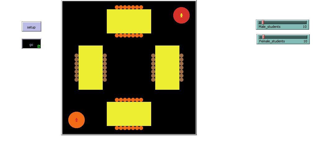 to setup clear-all cro Male_students [ set shape "person" setxy 13 13 set color yellow ] cro Female_students [ set shape "person" setxy -13 -13 set color red ] ;Seating places for students in Cafe ask patches[ sprout 1 [ set color red set shape "circle" set size 4 setxy 13 13 stamp die ] ] ;Seating places for students in Cafe ask patches[ sprout 1 [ set color orange set shape "circle" set size 4 setxy -13 -13 stamp die ] ] ;Seating places for students in Cafe ask patches with [pxcor = -13 and pycor > -4 and pycor < 4][ sprout 1 [ set color brown set shape "circle" set size 1 stamp die ] ] ;Seating places for students in Cafe ask patches with [pxcor = 13 and pycor > -4 and pycor < 4][ sprout 1 [ set color brown set shape "circle" set size 1 stamp die ] ] ;Seating places for students in Cafe ask patches with [pxcor = 6 and pycor > -4 and pycor < 4][ sprout 1 [ set color brown set shape "circle" set size 1 stamp die ] ] ;Seating places for students in Cafe ask patches with [pxcor = -6 and pycor > -4 and pycor < 4][ sprout 1 [ set color brown set shape "circle" set size 1 stamp die ] ] ;Seating places for students in Cafe ask patches with [pycor = -8 and pxcor > -4 and pxcor < 4][ sprout 1 [ set color orange set shape "circle" set size 1 stamp die ] ] ;Seating places for students in Cafe ask patches with [pycor = 8 and pxcor > -4 and pxcor < 4][ sprout 1 [ set color orange set shape "circle" set size 1 stamp die ] ] ;Seating places for students in Cafe ask patches with [pycor = -15 and pxcor > -4 and pxcor < 4][ sprout 1 [ set color orange set shape "circle" set size 1 stamp die ] ] ;Seating places for students in Cafe ask patches with [pycor = 15 and pxcor > -4 and pxcor < 4][ sprout 1 [ set color orange set shape "circle" set size 1 stamp die ] ] Setup-Food Setup-Food2 Setup-Food3 Setup-Food4 end to go ask turtles with [color = blue][setxy 13 0] ask turtles with [color = blue ][setxy 13 3] ask turtles with [color = blue][setxy 13 2] ask turtles with [color = blue][setxy 13 1] ask turtles with [color = blue][setxy 13 0] ask turtles with [color = blue][setxy 13 -1] ask turtles with [color = blue][setxy 13 -2] ask turtles with [color = blue][setxy 13 -3] ask turtles with [color = pink][setxy -3 -8] ask turtles with [color = pink][setxy -2 -8] ask turtles with [color = pink][setxy -1 -8] ask turtles with [color = pink][setxy 0 -8] ask turtles with [color = pink][setxy 1 -8] ask turtles with [color = pink][setxy 2 -8] end to square end to Setup-Food ;tables for Stduents in Cafe ask patches with [pxcor = 12 and pycor > -6 and pycor < 6 ] [ set pcolor yellow ] ask patches with [pxcor = 11 and pycor > -6 and pycor < 6 ] [ set pcolor yellow ] ask patches with [pxcor = 10 and pycor > -6 and pycor < 6 ] [ set pcolor yellow ] ask patches with [pxcor = 9 and pycor > -6 and pycor < 6 ] [ set pcolor yellow ] ask patches with [pxcor = 8 and pycor > -6 and pycor < 6 ] [ set pcolor yellow ] ask patches with [pxcor = 7 and pycor > -6 and pycor < 6 ] [ set pcolor yellow ] end to Setup-Food2 ;Tables for students in Cafe ask patches with [pxcor = -12 and pycor > -6 and pycor < 6 ] [ set pcolor yellow ] ask patches with [pxcor = -11 and pycor > -6 and pycor < 6 ] [ set pcolor yellow ] ask patches with [pxcor = -10 and pycor > -6 and pycor < 6 ] [ set pcolor yellow ] ask patches with [pxcor = -9 and pycor > -6 and pycor < 6 ] [ set pcolor yellow ] ask patches with [pxcor = -8 and pycor > -6 and pycor < 6 ] [ set pcolor yellow ] ask patches with [pxcor = -7 and pycor > -6 and pycor < 6 ] [ set pcolor yellow ] end to Setup-Food3 ;tables for Stduents in Cafe ask patches with [pycor = -14 and pxcor > -6 and pxcor < 6] [ set pcolor yellow ] ask patches with [pycor = -13 and pxcor > -6 and pxcor < 6] [ set pcolor yellow ] ask patches with [pycor = -12 and pxcor > -6 and pxcor < 6] [ set pcolor yellow ] ask patches with [pycor = -11 and pxcor > -6 and pxcor < 6] [ set pcolor yellow ] ask patches with [pycor = -10 and pxcor > -6 and pxcor < 6 ] [ set pcolor yellow ] ask patches with [pycor = -9 and pxcor > -6 and pxcor < 6 ] [ set pcolor yellow ] end to Setup-Food4 ;tables for Stduents in Cafe ask patches with [pycor = 14 and pxcor > -6 and pxcor < 6] [ set pcolor yellow ] ask patches with [pycor = 13 and pxcor > -6 and pxcor < 6] [ set pcolor yellow ] ask patches with [pycor = 12 and pxcor > -6 and pxcor < 6] [ set pcolor yellow ] ask patches with [pycor = 11 and pxcor > -6 and pxcor < 6] [ set pcolor yellow ] ask patches with [pycor = 10 and pxcor > -6 and pxcor < 6 ] [ set pcolor yellow ] ask patches with [pycor = 9 and pxcor > -6 and pxcor < 6 ] [ set pcolor yellow ] end