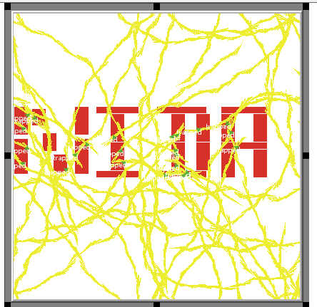 observation: The visualization window of model show Name of the author of this code in Red colours and model monitor the trapped and not trapped turtles in author name letter.