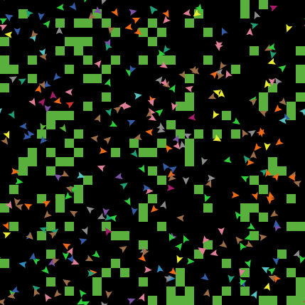 turtles-own [energy] to go if ticks >= 500 [ stop ] move-turtles eat-grass reproduce check-death regrow-grass tick end to eat-grass ask turtles [ if pcolor = green [ set pcolor black set energy (energy + energy-from-grass) ] ifelse show-energy? [ set label energy ] [set label "" ] ] end to reproduce ask turtles [ if energy > birth-energy [ set energy energy - birth-energy hatch 1 [ set energy birth-energy ] ] ] end to check-death ask turtles [ if energy <= 0 [ die ] ] end to regrow-grass ask patches [ if random 100 < 3 [ set pcolor green ] ] end to setup clear-all setup-patches setup-turtles reset-ticks end to setup-patches ask patches [ set pcolor green] end to setup-turtles create-turtles number [ setxy random-xcor random-ycor ] end to move-turtles ask turtles [ right random 360 forward 1 set energy energy - 1 ] end