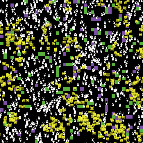 This project explores a simple ecosystem made up of rabbits, grass, and weeds. The rabbits wander around randomly, and the grass and weeds grow randomly. When a rabbit bumps into some grass or weeds, it eats the grass and gains energy. If the rabbit gains enough energy, it reproduces. If it doesn't gain enough energy, it dies.