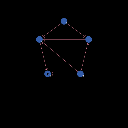 breed [nodes node] ;; noeuds breed [walkers walker] ;; agents qui bougent entre les noeuds walkers-own [location] ;; mémorise le noeud où se trouve le walker to setup clear-all set-default-shape nodes "circle" create-nodes 5 [ set color Blue set size 2 set label who ] layout-circle nodes 10 ask node 0 [ setxy 0 13 ] ask node 1 [ setxy 7.5 7.5 ] ask node 2 [ setxy -7.5 7.5 ] ask node 3 [ setxy -5 -3 ] ask node 4 [ setxy 5 -3 ] ask node 0 [ create-link-to node 1 [tie set color pink set thickness 0.1 ]] ask node 0 [ create-link-to node 2 [tie set color pink set thickness 0.1 ]] ask node 1 [ create-link-to node 2 [tie set color pink set thickness 0.1 ]] ask node 2 [ create-link-to node 3 [tie set color pink set thickness 0.1 ]] ask node 4 [ create-link-to node 1 [tie set color pink set thickness 0.1 ]] ask node 4 [ create-link-to node 3 [tie set color pink set thickness 0.1 ]] ask node 4 [ create-link-to node 2 [tie set color pink set thickness 0.1 ]] ;; put some "walker" turtles on the network create-walkers 1 [ set color black set location one-of nodes move-to location ] reset-ticks end to go ask links [set thickness 0 ] ask walkers [ let new-location one-of [link-neighbors] of location ;; change the thickness of the link I just crossed over ask [link-with new-location] of location [ set thickness 0.5 set color green] move-to new-location set location new-location ] tick end
