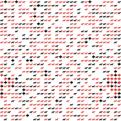 globals[ decrease-energy] turtles-own[energy] breed [ovejas oveja] breed [lobos lobo] breed [hojas hoja] to setup ca ask patches [set pcolor white] ;; forma de las razas set-default-shape ovejas "sheep" set-default-shape lobos "wolf" set-default-shape hojas "leaf" ; decremento energía en cada tick set decrease-energy 3 ; Mundo Incial , poblar con las tres especias al azar de manera uniforme ask n-of num-agentes patches [ sprout 1 [ set color black set breed one-of (list ovejas lobos hojas) ] ] ; energia inicial de los agentes ask lobos [set energy 15] ask ovejas [set energy 10] ask hojas [set energy 5] reset-ticks end to go ; comportamiento hojas comp-hojas ; comportamiento ovejas comp-ovejas ; comportamieto lobos comp-lobos tick end to comp-hojas ask hojas [ set energy energy - .1 ; decrementar energía if energy <= 0 [die] ; muere si energía es muy baja ] ; espacio vacio con más de tres vecinos hojas genera una hoja ask patches with [ count turtles-here = 0] [ ;set pcolor blue if count vecinos-hojas >= 3 [ sprout 1 [ set breed hojas set color green]] ; marca las parcelas con un agente generico ] ask turtles with [color = green] [ set breed hojas set color red] end to comp-ovejas ask ovejas [ set energy energy - decrease-energy ; decrementar energía if energy <= 0 [die] ; muere si energía es muy baja ] ask ovejas with [ count vecinos-hojas > 0] ;OJO TENR CUIDADO SI DOS OVEJAS DEBEN IR A UNA HOJA [ set color blue let parcelaHoja one-of vecinos-hojas if parcelaHoja != nobody [let laHoja one-of turtles-on parcelaHoja set energy energy + [energy] of laHoja ask laHoja [die] ; la hoja queda consumida por la oveja ask patch-here [ sprout 1 [set breed ovejas set energy 10 set color red]] move-to parcelaHoja ; se mueve donde está la hoja ] ] end to comp-lobos ask lobos [ set energy energy - decrease-energy ; decrementar energía if energy <= 0 [die] ; muere si energía es muy baja ] let lobos-cerca-a-ovejas lobos with [count vecinos-ovejas > 0] let lobos-lejos-de-ovejas lobos with [ count vecinos-ovejas = 0] ; si el lobo no tiene ovejas como vecinos se mueve a un sitio contiguo vacio o que tenga hojas ask lobos-cerca-a-ovejas ;OJO TENR CUIDADO SI DOS lobos DEBEN IR A UNA misma oveja [ ;set color blue let parcelaOveja one-of vecinos-ovejas if parcelaOveja != nobody [let laOveja one-of turtles-on parcelaOveja set energy energy + [energy] of laOveja ask laOveja [die] ; la oveja queda consumida por el lobo ask patch-here [ sprout 1 [set breed lobos set energy 15 set color red]] move-to parcelaOveja ; se mueve donde está la oveja ] ] ask lobos-lejos-de-ovejas [mover-lobo] end to mover-oveja ask ovejas with [ count vecinos-hojas = 0] [ let posibleLugar one-of neighbors with [ parcela-vacia] if posibleLugar != nobody [ move-to posibleLugar] ] end to mover-lobo ask lobos with [ count vecinos-ovejas = 0] [ let posibleLugar one-of neighbors with [ parcela-vacia] ifelse posibleLugar != nobody [ move-to posibleLugar] [ let posibleLugar2 one-of neighbors with [parcela-con-hoja] if posibleLugar2 != nobody [move-to posibleLugar2] ; moverse a una parcela con hojas si es posible ] ] end ; reportes to-report vecinos-hojas report ( neighbors with [ any? hojas-here ]) end to-report vecinos-ovejas report ( neighbors with [ any? ovejas-here ]) end to-report vecinos-lobos report ( neighbors with [ any? lobos-here ]) end to-report parcela-vacia report count turtles-here = 0 end to-report parcela-con-hoja report count hojas-here > 0 end
