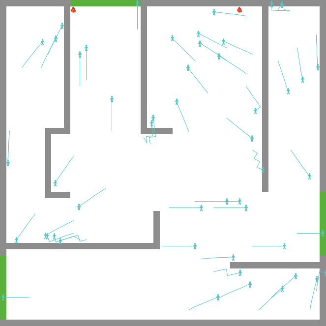 Globals [ Safe Burned wall exit] breed [fires fire] breed [people person] people-own [ points state ] to setup ca reset-ticks setup-patches setup-people setup-fires end to setup-people set-default-shape people "person" ask n-of n-people (patches with [pcolor = white]) [sprout-people 1] ask people [ set color cyan ] ask people [ set points 2 ] end to setup-fires set-default-shape fires "fire" ask n-of 2 (patches with [pcolor = white]) [sprout-fires 1] ask fires [ set color red set ycor 49] end to setup-patches ask patches [ ; Setting the external walls if pycor = 0 or pycor = 50 or pxcor = 50 or pxcor = 0 [ set pcolor gray ] ; baundry walls ; Setting 3 exits if pxcor = 50 and pycor > 10 and pycor < 21 [ set pcolor green ] ; right exit if pxcor = 0 and pycor > 0 and pycor < 11 [ set pcolor green ] ; left exit if pycor = 50 and pxcor > 10 and pxcor < 22 [ set pcolor green ] ; top exit ; Setting interal walls if pxcor > 0 and pxcor < 25 and pycor = 12 [ set pcolor gray ] ; wall 1.1 if pxcor = 24 and pycor > 11 and pycor < 18 [ set pcolor gray ] ; wall 1.2 if pxcor = 10 and pycor > 30 and pycor < 50 [ set pcolor gray ] ; wall 2.1 if pxcor = 7 and pycor > 20 and pycor < 30 [ set pcolor gray ] ; wall 2.2 if pxcor > 6 and pxcor < 11 and pycor = 30 [ set pcolor gray ] ; wall 2.3 if pxcor > 6 and pxcor < 11 and pycor = 20 [ set pcolor gray ] ; wall 2.4 if pxcor = 22 and pycor > 30 and pycor < 50 [ set pcolor gray ] ; wall 3.1 if pxcor > 21 and pxcor < 27 and pycor = 30 [ set pcolor gray ] ; wall 3.2 if pxcor > 35 and pxcor < 50 and pycor = 9 [ set pcolor gray ] ; wall 4.1 if pxcor = 41 and pycor > 20 and pycor < 51 [ set pcolor gray ] ; wall 5.1 ; Setting floor white if pcolor = black [ set pcolor white ] ] ask patches with [ pcolor = gray ] [ ask neighbors with [ pcolor = white ] [set pcolor 9 ]] end to setup-patches-old ask patches with [pycor <= 79 and pycor >= 0 and pxcor = 0] [set pcolor blue] ask patches [ set pcolor white ] ask patches with [ pycor >= -30 and pycor >= 30] [ set pcolor grey ] ask patches with [ pycor <= -30 and pycor <= 30] [ set pcolor grey ] ask patches with [ pxcor >= -30 and pxcor >= 30] [ set pcolor grey ] ask patches with [ pxcor <= -30 and pxcor <= 30] [ set pcolor grey ] ask patches with [pycor <= 29 and pycor >= 0 and pxcor = 22 ] ; vertical [ set pcolor black ] ask patches with [pycor <= -11 and pycor >= -16 and pxcor = 03 ] ; vertical [ set pcolor black ] ask patches with [pycor <= 29 and pycor >= 07 and pxcor = -2 ] ; vertical [ set pcolor black ] ask patches with [pycor <= 29 and pycor >= 1 and pxcor = -15 ] ; vertical [ set pcolor black ] ask patches with [pycor <= 1 and pycor >= -6 and pxcor = -21 ] ; vertical [ set pcolor black ] ask patches with [pycor <= -21 and pycor >= -27 and pxcor = 12 ] ; vertical [ set pcolor black ] ask patches with [pycor <= -21 and pycor >= -27 and pxcor = -3 ] ; vertical [ set pcolor black ] ask patches with [pycor <= -18 and pycor >= -22 and pxcor = -15 ] ; vertical [ set pcolor black ] ask patches with [pxcor <= 29 and pxcor >= 04 and pycor = -16 ] ; horizontal [ set pcolor black ] ask patches with [pxcor <= 4 and pxcor >= -2 and pycor = 06 ] ; horizontal [ set pcolor black ] ask patches with [pxcor <= -15 and pxcor >= -20 and pycor = 1 ] ; horizontal [ set pcolor black ] ask patches with [pxcor <= 18 and pxcor >= 12 and pycor = -21 ] ; horizontal [ set pcolor black ] ask patches with [pxcor <= 3 and pxcor >= -3 and pycor = -21 ] ; horizontal [ set pcolor black ] ask patches with [pxcor <= -15 and pxcor >= -29 and pycor = -22 ] ; horizontal [ set pcolor black ] ask patches with [pxcor <= -3 and pxcor >= -14 and pycor = 30 ] ; horizontal [ set pcolor lime ] ask patches with [pycor <= -22 and pycor >= -29 and pxcor = -30 ] ; vertical [ set pcolor lime ] ask patches with [pycor <= -8 and pycor >= -15 and pxcor = 30 ] ; vertical [ set pcolor lime ] end to Go let hall patches with [pycor <= 0 and pycor >= -10 and pxcor <= 0 and pxcor >= -10 ] ; ask people ; [face one-of patches with [pycor <= 5 and pycor >= -5 and pxcor <= 5 and pxcor >= -5 ] fd 0.5 ] ; ask people-on hall ; [ face one-of patches with [pxcor <= -3 and pxcor >= -14 and pycor = 30 ]] people-move ; ignite tick end to people-move ask people [ ifelse [pcolor] of patch-here = green [ set state "exited"] [ ifelse [pcolor] of patch-here = 9 [][] if patch-ahead 0 != nobody [ ifelse [pcolor] of patch-ahead 0 = 9 [ ] [ face min-one-of (patches with [pcolor = green ]) [distance myself] fd 1 ] pd ] ] ] end to walk let hall patches with [pycor <= 0 and pycor >= -10 and pxcor <= 0 and pxcor >= -10 ] ask people-on hall [ face one-of patches with [pxcor <= -3 and pxcor >= -14 and pycor = 30 ]] end to GoB ask people [face one-of patches with [pycor <= -22 and pycor >= -29 and pxcor = -29 ] fd 0.5 ] ask fires [ ask neighbors4 with [pcolor = white ] [ ignite ] ] tick end to GoC ask people [face one-of patches with [pycor <= -8 and pycor >= -15 and pxcor = 29 ] fd 0.5 ] ask fires [ ask neighbors4 with [pcolor = white ] [ ignite ] ] tick end to ignite ask fires [ if count neighbors4 > 0 [ ask neighbors4 with [pcolor = white ] [ sprout-fires 1 [ set color red ] set pcolor black ] ] ] end to avoid-walls ask people [ if [pcolor] of patch-ahead 0.5 = black [ set heading ( - heading ) fd 0.5 ] if [pcolor] of patch-ahead 0.5 = grey [ set heading ( - heading) fd 0.5 ] ] tick end