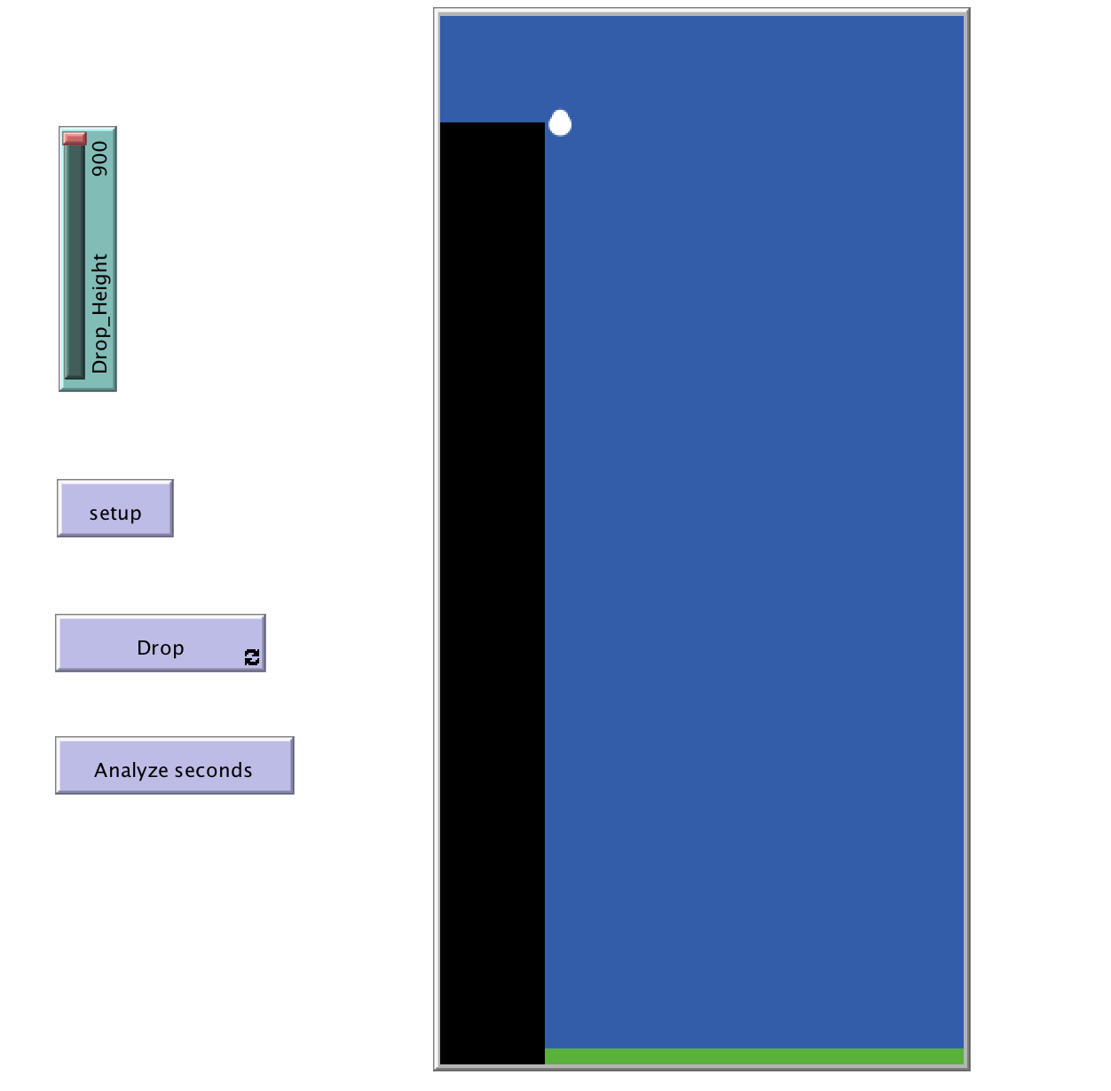 Use the slider to choose the height of the building, click setup to get the egg in place. Click "Drop" to make the egg fall all at once. Click "Analyze Seconds" to make the egg fall one second per click.