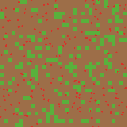 breed [ worms a-worms ] turtles-own [energy] to setup clear-all setup-patches setup-turtles reset-ticks end to setup-patches ask patches [ set pcolor green ] end to setup-turtles create-turtles worms-number [ set shape "circle" set color red set size 0.5 setxy random-xcor random-ycor ] end to go if ticks >= 150 [ stop ] move-turtles eat-grass reproduce check-death regrow-grass tick end to move-turtles ask turtles [ right random 360 forward 1 set energy energy - 1 ] end to eat-grass ask turtles [ if pcolor = green [ set pcolor brown set energy (energy + energy-from-compost) ] ifelse show-energy? [ set label energy ] [ set label "" ] ] end to reproduce ask turtles [ if energy > birth-energy [ set energy energy - birth-energy hatch 1 [ set energy birth-energy ] ] ] end to check-death ask turtles [ if energy <= 0 [ die ] ] end to regrow-grass ask patches [if random 100 < compost-refilling-rate [ set pcolor green ] ] end