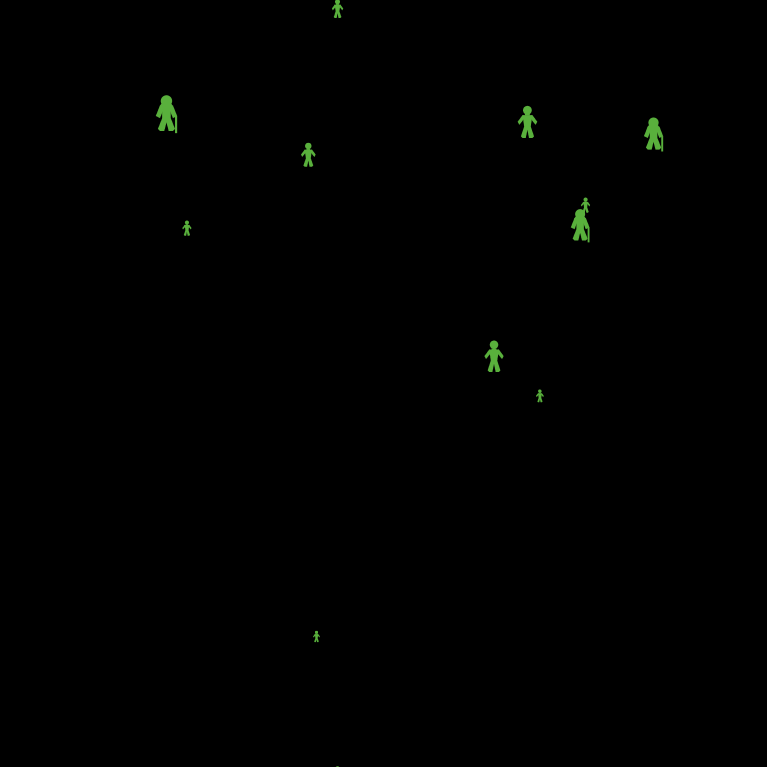 turtles-own [ sick? ;; if true, the turtle is sick infected? ;; if true, turtle is infected remaining-immunity ;; how many weeks of immunity the turtle has left sick-infected-time ;; how long, in weeks, the turtle has been infectious age ;; how many weeks old the turtle is sick-around ;; is there anyone sick around the turtle? nearest-sick ;; the nearest sick turtle around the full-life ;; how much the turtle will live get-sick-factor ;; disease recovery changes with age reproduce-number ;; Maximum number of sons/daughers a turtle may generate ] globals [ %infected ;; what % of the population is infectious %sick ;; what % of the population is sick %immune ;; what % of the population is immune %dead ;; Sickness death relative to total death (dead-sick / total-dead) dead-sick ;; How many ppl died by sickness dead-total ;; How many ppl died births ;; How many ppl born lifespan ;; the average lifespan of the turtle population chance-reproduce ;; The probability of a turtle being hatched each simulation tick per turtle in the simulation reproduce-factor ;; Factor of reproduction carrying-capacity ;; the number of turtles that can be in the world at one time immunity-duration ;; how many weeks immunity lasts ] ;; The setup is divided into four procedures to setup clear-all setup-constants setup-turtles update-global-variables update-display reset-ticks end ;; We create a variable number of turtles of which 10 are infectious, ;; and distribute them randomly to setup-turtles create-turtles number-people [ setxy random-xcor random-ycor set age random lifespan ;; Age is set full-life random-normal lifespan (10 * 52) while [full-life < age] [set age random lifespan] set sick-infected-time 0 set remaining-immunity 0 set infected? false update-size ;; easier to see set-get-sick-factor set-reproduce-number get-healthy ] ask n-of 0 turtles [ get-infected ] end to setup-constants set lifespan 70 * 52 ;; 70 times 52 weeks = 70 years = 3640 weeks old set carrying-capacity 2000 set reproduce-factor 0.1 set immunity-duration 9999 end to go update-chance-reproduce if random-float 100 < chance-new-infected [create-new-infected] if random-float 100 < chance-new-sick [create-new-sick] ask turtles [ update-size set-get-sick-factor get-older move flee if infected? [ infect get-sick ] if sick? [ recover-or-die ] ifelse sick? [ infect ] [ reproduce ] ] update-global-variables update-display tick end to set-get-sick-factor set get-sick-factor random-normal ( ((age / 52) ^ 6) * (1.78 * (10 ^ -11)) ) ( 0.5 ) end to get-sick ;; turtle procedure if sick-infected-time > 2 and random-float 100 < (chance-getting-sick * get-sick-factor);; [ set infected? false set sick? true set remaining-immunity 0] if sick-infected-time > duration [become-immune] end to get-infected ;; set infected? true set remaining-immunity 0 end to get-healthy ;; turtle procedure set sick? false set infected? false set remaining-immunity 0 set sick-infected-time 0 end to become-immune ;; turtle procedure set sick? false set infected? false set sick-infected-time 0 set remaining-immunity immunity-duration end to update-chance-reproduce if count turtles > 0 ;;[set chance-reproduce random-normal (100 * (reproduce-factor / count turtles) - (reproduce-factor / (count turtles * 10))) (count turtles / 10 ^ 4)] ;; The most ppl on the simulation, lesser is the intention of reproducing. Needs improvement [set chance-reproduce 1] end to set-reproduce-number ifelse maximum-sons-by-person > 0 [ set reproduce-number random (maximum-sons-by-person + 1) ] ;; random command excludes the number eg: random 4 generates 0, 1, 2 or 3. So I summed 1 to the variable. [ set reproduce-number 0 ] end to create-new-infected create-turtles 1 [ setxy random-xcor random-ycor set age random lifespan set full-life random-poisson lifespan set sick-infected-time 0 set remaining-immunity 0 update-size set-reproduce-number get-healthy get-infected ] end to create-new-sick create-turtles 1 [ setxy random-xcor random-ycor set age random lifespan set full-life random-poisson lifespan set sick-infected-time 0 set remaining-immunity 0 update-size set-reproduce-number get-healthy get-infected get-sick ] end to flee if flee-from-sick? [ find-sicks if any? sick-around [find-nearest-sick if distance nearest-sick < 2 [ bk 3 ]] ] end to find-sicks ;; Find group of sick ppl next to agent. set sick-around other turtles in-radius 5 with [ sick? ] end to find-nearest-sick ;; People Flee from nearest sick in the simulation set nearest-sick min-one-of sick-around [distance myself] end ;;Turtle counting variables are advanced. to get-older ;; turtle procedure ;; Turtles die of old age once their age exceeds the ;; lifespan (set at 50 years in this model). set age age + 1 if age > full-life [ set dead-total dead-total + 1 die ] if immune? [ set remaining-immunity remaining-immunity - 1 ] if infected? [ set sick-infected-time sick-infected-time + 1 ] if sick? [ set sick-infected-time sick-infected-time + 1 ] end ;; Turtles move about at random. to move ;; turtle procedure ifelse sick-can-move? [ rt random 100 lt random 100 ifelse age < (50 * 52) [ fd 1.0 ] [ fd 0.5 ] ] [ rt random 100 lt random 100 if sick? = false [ifelse age < (50 * 52) [ fd 1.0 ] [ fd 0.5 ] ]] end ;; If a turtle is sick, it infects other turtles on the same patch. ;; Immune turtles don't get sick. to infect ;; turtle procedure ask other turtles-here with [ not infected? and not immune? and not sick? ] [ if random-float 100 < infectiousness [ get-infected ] ] end ;; Once the turtle has been sick long enough, it ;; either recovers (and becomes immune) or it dies. to recover-or-die ;; turtle procedure if sick-infected-time > duration ;; If the turtle has survived past the virus' duration, then [ ifelse random-float 100 < chance-recover ;; either recover or die [ become-immune ] [ set dead-total dead-total + 1 set dead-sick dead-sick + 1 die ] ] end ;; If there are less turtles than the carrying-capacity ;; then turtles can reproduce. to rep