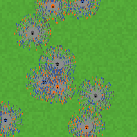 globals [ guest-count host-count choice gini-index-reserve lorenz-points ] ;extensions [ import-a ] ;extensions [ rnd ] breed [hosts host] breed [guests guest] breed [trees tree] hosts-own [ h-race ;w-b-a-ratio w-ratio b-ratio a-ratio w-cnt b-cnt a-cnt attract num-guest ] guests-own [ g-race cate ] to setup clear-all ask patches [set pcolor green - random-float 0.5] ;ask patches [set pcolor 56 ] ;import-drawing "map.jpg" set-default-shape guests "person" set-default-shape hosts "house" set host-count (white-hosts + black-hosts + asian-hosts) set guest-count (white-hosts + black-hosts + asian-hosts) ;;add number of hosts according to the input create-hosts white-hosts [ set size 2 set h-race "White" set color 105 ;; white = 105 set xcor -20 + random 40 set ycor -20 + random 50 ] create-hosts black-hosts [ set size 2 set h-race "Black" set color 3 ;; grey = 3 set xcor -20 + random 40 set ycor -20 + random 50 ] create-hosts asian-hosts [ set size 2 set h-race "Asian" set color 25 ;; yellow = 45 set xcor -20 + random 40 set ycor -20 + random 50 ] ;;set hosts apart for visual purpose ask hosts [move-to one-of patches with [not any? other hosts in-radius 2]] update-lorenz-and-gini reset-ticks end to go ;; update the ratio for all hosts based on the guest race ask hosts [ if count link-neighbors > 0 [ ;set w-b-a-ratio (list ((count (link-neighbors with [g-race = "White"])) / count link-neighbors) ;((count (link-neighbors with [g-race = "Black"])) / count link-neighbors) ;((count (link-neighbors with [g-race = "Asian"])) / count link-neighbors) ) set w-ratio count (link-neighbors with [g-race = "White"])/ count link-neighbors set b-ratio count (link-neighbors with [g-race = "Black"])/ count link-neighbors set a-ratio count (link-neighbors with [g-race = "Asian"])/ count link-neighbors set w-cnt count (link-neighbors with [g-race = "White"]) set b-cnt count (link-neighbors with [g-race = "Black"]) set a-cnt count (link-neighbors with [g-race = "Asian"]) ] set num-guest count (link-neighbors) ] ask links [ set color gray ] set guest-count (guest-count + 1) create-guest make-decision find-partner ;;decide the race of a guest by probability update-lorenz-and-gini tick end ;; used for creating a new guest to create-guest create-guests 1 [ ;set new? true let a-g-prob 1 - w-g-prob - b-g-prob let probs ( list (w-g-prob) (b-g-prob) (a-g-prob) ) ;let race-col [ "White" "Black" "Asian" ] ;set g-race first rnd:weighted-one-of-list (map list race-col probs) last set g-race (random-pick-guest-race probs) if g-race = "White" [set color 105 set cate 1] if g-race = "Black" [set color 3 set cate 2] if g-race = "Asian" [set color 25 set cate 3] ] end to make-decision [listing] ask (max-one-of guests [who]) [ if listing != nobody [ create-link-with listing [ set color grey ] ;; position the new node near its partner move-to listing fd 3 + (random 6) ] ] end to-report find-partner ;; update the attractiveness of hosts based on the guest race --> attractiveness is a list of probabilities let w-a-1 1 - w-w-1 - w-b-1 let b-a-1 1 - b-w-1 - b-b-1 let a-w-1 1 - a-a-1 - a-b-1 let w-a-2 1 - w-w-2 - w-b-2 let b-a-2 1 - b-w-2 - b-b-2 let a-w-2 1 - a-a-2 - a-b-2 ;let w-pref reduce sentence (map [[a] -> [w-ratio] of hosts with [who = a]] (range 0 (host-count))) ;let b-pref reduce sentence (map [[a] -> [b-ratio] of hosts with [who = a]] (range 0 (host-count))) ;let a-pref reduce sentence (map [[a] -> [a-ratio] of hosts with [who = a]] (range 0 (host-count))) let w-pref reduce sentence (map [[a] -> [w-cnt] of hosts with [who = a]] (range 0 (host-count))) let b-pref reduce sentence (map [[a] -> [b-cnt] of hosts with [who = a]] (range 0 (host-count))) let a-pref reduce sentence (map [[a] -> [a-cnt] of hosts with [who = a]] (range 0 (host-count))) let temp-race ([g-race] of (max-one-of guests [who])) let base-ratio (map [[a b c] -> a + b + c ] w-pref b-pref a-pref) if temp-race = "White" [ ;show temp-race ;;show base-ratio ;; guest-host preference: guest-host pref let gh-pref (sentence (n-values white-hosts [w-w-1]) (n-values black-hosts [w-b-1]) (n-values asian-hosts [w-a-1])) set gh-pref (map [[a] -> a * 1] gh-pref ) ;;guest-reviewer pref let gr-pref (sentence (n-values white-hosts [w-w-2]) (n-values black-hosts [w-b-2]) (n-values asian-hosts [w-a-2])) ;;show gh-pref ;; add up base-ratio, gh-pref and gr-pref let gr-pref2 (map [[a b] -> a * b] base-ratio gr-pref) let att (map [[a b] -> a + b ] gh-pref gr-pref) ;let att (map [[a b c] -> a + b + c ] base-ratio gh-pref gr-pref) ;let host-order (range 0 host-count) set choice (random-pick-host att) ;set choice first rnd:weighted-one-of-list (map list host-order att) last ;show choice ;show att report host choice ] if temp-race = "Black" [ ;show temp-race ;;show base-ratio ;; first preference: guest-host pref ;;let gh-pref (list a-w-pref a-w-pref a-w-pref a-b-pref a-b-pref a-b-pref a-a-pref a-a-pref a-a-pref) let gh-pref (sentence (n-values white-hosts [b-w-1]) (n-values black-hosts [b-b-1]) (n-values asian-hosts [b-a-1])) set gh-pref (map [[a] -> a * 1] gh-pref ) ;;show gh-pref ;; secondary preference: guest-reviewer pref let gr-pref (sentence (n-values white-hosts [b-w-2]) (n-values black-hosts [b-b-2]) (n-values asian-hosts [b-a-2])) ;let gr-pref (list a-w a-w a-w a-b a-b a-b a-a a-a a-a) ;; add up base-ratio, gh-pref and gr-pref let gr-pref2 (map [[a b] -> a * b] base-ratio gr-pref) let att (map [[a b] -> a + b ] gh-pref gr-pref) ;let att (map [[a b c] -> a + b + c ] base-ratio gh-pref gr-pref) ;let host-order (range 0 host-count) set choice (random-pick-host att) ;set choice first rnd:weighted-one-of-list (map list host-order att) last ;show choice ;show att report host choice ] if temp-race = "Asian" [ ;show temp-race ;;show base-ratio ;; first preference: guest-host pref ;;let gh-pref (list a-w-pref a-w-pref a-w-pref a-b-pref a-b-pref a-b-pref a-a-pref a-a-pref a-a-pref) let gh-pref (sentence (n-values white-hosts [a-w-1]) (n-values black-hosts [a-b-1]) (n-values asian-hosts [a-a