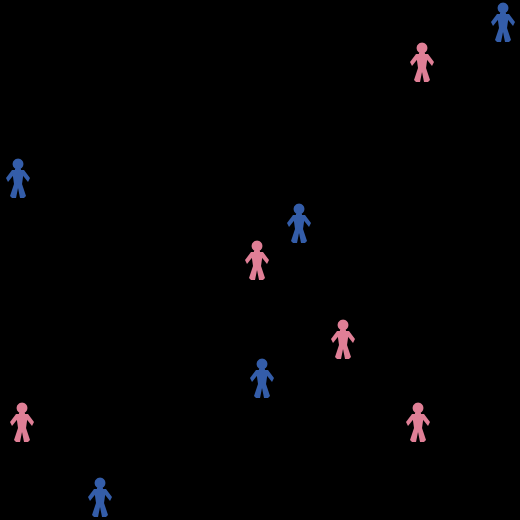 breed [males male] breed [females female] turtles-own [attract standards married] links-own [dif age] patches-own [couple] globals [breakup] to setup clear-all set breakup 0 create-males c [set color blue set shape "person" setxy random-pxcor random-pycor set attract random-normal attmean 2 set standards random-normal stmean 1] create-females c [set color pink set shape "person" setxy random-pxcor random-pycor set attract random-normal attmean 2 set standards random-normal stmean 1] reset-ticks end to go ; ask males with [ count my-links > 1] [face one-of in-link-neighbors] ;ask females with [ count my-links > 1] [face one-of in-link-neighbors] ask turtles [ forward 0.001 ] repeat c [ breakups] ask males [if (count my-links = 0) [create-links-with females in-radius rad with [attract >= [standards] of myself and [attract] of myself >= standards] [set age 0]]] ask turtles [ if (count my-links > 0)[face one-of in-link-neighbors]] ask turtles [ if (count my-links > 0)[set color green]] ask males [ if (count my-links = 0)[set color blue]] ask females [ if (count my-links = 0)[set color pink]] linkage ask links [ set label age ] tick end to breakups ; ask links [ set current abs ([attract] of end1) ] ; ask males [if (count my-links = 1) [create-links-with females in-radius rad with [attract > [current] of myself ; and [attract] of myself >= standards and [attract]] [set age 0]]] ask links [ set dif abs ([attract] of end1 - [attract] of end2) ] ask turtles [ if (count my-links > 1) [ let p min-one-of my-links [dif] if [age] of p <= 10 [ask p [die]]]] ask turtles [ if (count my-links > 1) [ let p min-one-of my-links [dif] if [age] of p > 10 [ask p [die] set breakup breakup + 1 ]]] end to linkage ask links [set age age + 1] end to targetmove let target in-link-neighbors if (count my-links < 1 ) [face target] end to stud create-males 1 [set color yellow set shape "face happy" setxy random-pxcor random-pycor set attract 100 set standards 0] end to labels ask turtles [ set label attract ] ask links [ set label age ] end to hidelabels ask turtles [ set label "" ] end
