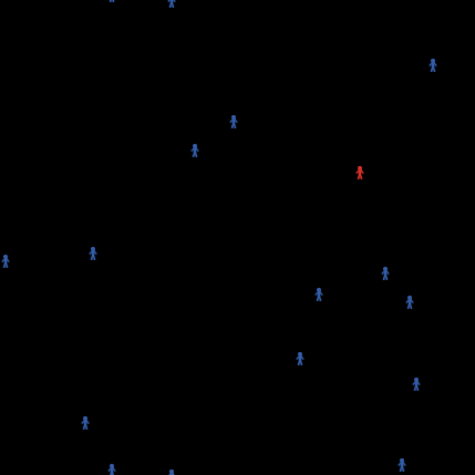 When an infected (red) person comes into direct contact with a non-infected (Blue) person the non-infected (blue) person will become red, indicating they too are now infected.