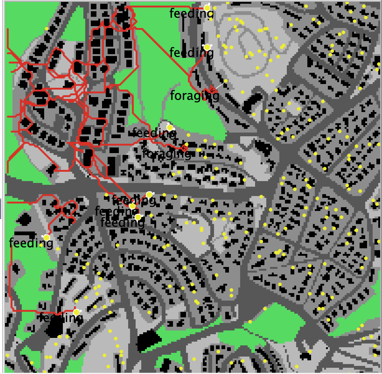 Pigs know the open space that they wake up at. We ignore the process of looking for a path to the snack. We assume the pig looked and found a least-cost-path (LCP). During the day people threw out food into garbage cans => Snacks appear randomly in built areas. Each snack emanates smell that decays with distance. The smell of snacks can have a cut-off smell-range.