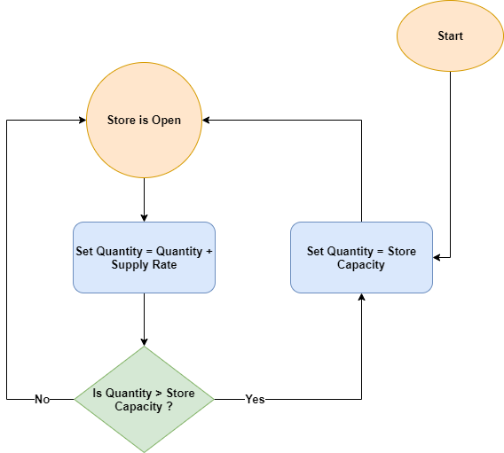 - After the customers have performed their respective actions, the stores update the quantity as per the supply rate. The order of stores execution is random and is unimportant.