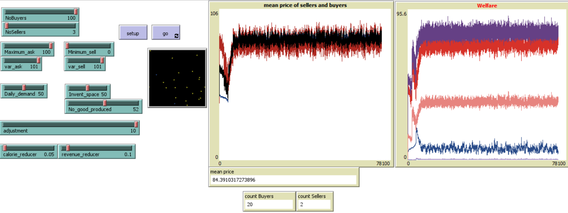 Globals [price last_price producer-surplus consumer-surplus total-surplus] Breed [Buyers Buyer] Breed [Sellers Seller] Buyers-own [Maximum_asking_price willingtopay consumersurplus B_stock Demand able_buy B_price last_B_Price calorie] Sellers-own [Minimum_selling_price willingtosell producersurplus S_stock Inventory_space able_sell S_price last_S_price revenue] turtles-own [partner] to setup clear-all create-Buyers NoBuyers[ setxy random-xcor random-ycor ] create-Sellers NoSellers[ setxy random-xcor random-ycor ] ask Buyers [ set color yellow set Maximum_asking_price Maximum_ask - random var_ask set B_stock 0 set last_B_price Maximum_asking_price set B_price last_B_price set calorie 100 ] ask Sellers [ set color blue set Minimum_selling_price Minimum_sell + random var_sell set S_stock 0 set last_S_price Minimum_selling_price set S_price last_S_price set revenue 100 ] reset-ticks end to go update-plots produce_good_and_income set_price seek_seller ask Sellers with [color = red][ set color blue] ask Sellers [ if revenue <= 0 [die]] ask Buyers [ if calorie <= 0 [die] ] tick end to produce_good_and_income ask Sellers [ set Inventory_space Invent_space if S_stock < Inventory_space [ set S_stock S_stock + No_good_produced if S_stock >= Inventory_space [ set S_stock Inventory_space ]]] ask Buyers [ set Demand Demand + Daily_demand ] end to set_price ask Sellers [ ifelse able_sell = 0 [ set revenue revenue - revenue_reducer set S_price last_S_price - random-float adjustment if S_price < Minimum_selling_price[ set S_price Minimum_selling_price]] [let prob random 6 if prob = 1 [ set S_price last_S_price + random adjustment]] set able_sell 0 ] ask Buyers [ ifelse able_buy = 0 ; variable, when able to buy, + 1, will be wiped away [ set calorie calorie - calorie_reducer set B_price last_B_price + random-float adjustment if B_price > Maximum_asking_price [ set B_price Maximum_asking_price ]] [let prob random 6 if prob = 1 [ set B_price last_B_price - random adjustment]] set able_buy 0 ] ; reset the values end to seek_seller ask buyers [ let available_sellers Sellers with [color = blue] let whom one-of available_sellers if whom = nobody [stop] ask whom [set color red] let seller_price [S_price] of whom if (B_price - seller_price >= 0) [ let common_price (B_price + [S_price] of whom) / 2 set consumersurplus (Maximum_asking_price - common_price) set last_B_price common_price set calorie calorie + 1 set able_buy able_buy + 1 ask whom [ set last_S_price common_price set able_sell able_sell + 1 set revenue revenue + 1 set producersurplus (common_price - Minimum_selling_price) ] ] ] end