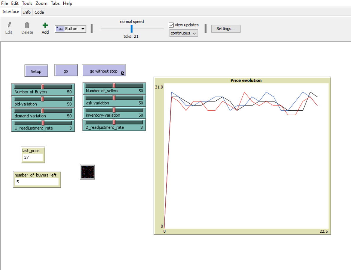 breed [buyers buyer] breed [sellers seller] breed [farmers farmer] breed [speculators speculator] breed [firms firm] ;breed [happiest happy] ; to take out fulfilled buyers out of the market ;breed [no-stocks no-stock] ;breed [unhappiest_buyers unhappy_buyer] ;breed [unhappiest_sellers unhappy_seller] Globals [b-price s-price bid_schedule ask_schedule last_price round_price number_of_buyers_left highest_bid lowest_ask number_of_sellers_left rounds periods] buyers-own [bid stock_demanded Own_ID Money_Holdings] sellers-own [ask_offer inventory Own_ID Money_Holdings] farmers-own [ask_offer inventory Own_ID Money_Holdings] speculators-own [bid stock_demanded ask_offer inventory Own_ID Money_Holdings] firms-own [bid stock_demanded Own_ID Money_Holdings] to Setup clear-all create-firms Number-of-Firms [ set Own_ID 0 set color blue ask firms [find_patch] set bid random bid-variation set stock_demanded random demand-variation set Money_Holdings 500 ] ; create a sort-of demand curve, placeholder, will be more 'adaptive' in the future where bids are endogenously generated instead of exogenously determined create-farmers Number-of-Farmers [ set Own_ID 1 set color red ask farmers [find_patch] set ask_offer random ask-variation set inventory random inventory-variation set Money_Holdings 500 ] ; create a sort-of supply curve create-speculators Number-of-Speculators [ set Own_ID 2 set color green ask speculators [find_patch] set bid 0 set ask_offer 0 set inventory 0 set Money_Holdings 500 ] set s-price [] set bid_schedule [] set ask_schedule [] set last_price 0 set number_of_buyers_left 0 set number_of_sellers_left 0 set rounds 1 set periods 1 reset-ticks end ;;;; setup stuff ;;;;;;; to find_patch setxy random-xcor random-ycor while [any? other turtles-here] [find_patch] end ;;;;;;;;;;;;;;;;;;;;;;;; ;;;;;; To go ;;;;;;;;;;; to go ;;if round = 1 [ ;; do accounting, this is a new period afterall. Determine performance in the last period. This is where period-to-period readjustment will happen ;; farmer harvest and decide how much to plant based on past. After this they decide on initial bid ;; speculators see how much is planted, and decide whether to bid, or ask, and at what price and quantity ;; firm determines bid based on whether current income can afford it] create_buyers create_sellers create_bid_schedule create_ask_schedule ;; print last first ask_schedule - when want to know the lowest asking price ;; print last first bid_schedule - when want to know the highest bid price ;; print last first bid_schedule ;; print first first bid_schedule - when want to know who is the higest bidder auction_round readjustment ; need to readjust based on rounds in the future if all? buyers [stock_demanded = 0][ stop] if all? sellers [inventory = 0][ stop] plot_stuff ; we do plot stuff first because of we are monitoring the more 'general breeds' return_to_original_breed round_accounting tick end to create_sellers ask farmers [ set breed sellers] ; ask speculators [ This is to let speculators become sellers under certain condition, yet to be introduced ; if .... [ ; set breed sellers] end to create_buyers ask firms [ set breed buyers] ; ask speculators [ This is to let speculators become buyers under certain condition, yet to be introduced ; if .... [ ; set breed buyers] end to create_bid_schedule let d [] set d sort ([who] of buyers) foreach d [ ID -> let temp2 [] set temp2 lput ID temp2 set temp2 lput ([bid] of buyer ID) temp2 set bid_schedule lput temp2 bid_schedule] set bid_schedule sort-by [ [x y] -> last x > last y] bid_schedule ; ordering the schedule from the highest bidder to the lowest bidder ; print bid_schedule end to create_ask_schedule let d [] set d sort ([who] of sellers) foreach d [ ID -> let temp2 [] set temp2 lput ID temp2 set temp2 lput ([ask_offer] of seller ID) temp2 set ask_schedule lput temp2 ask_schedule] set ask_schedule sort-by [ [x y] -> last x < last y] ask_schedule ; ordering the schedule from the lowest ask offer to the highest ; print ask_schedule end to auction_round if empty? bid_schedule [stop] ; highly unlikely while [(last first bid_schedule) >= (last first ask_schedule)] [ ask buyer (first first bid_schedule) [ ; the highest bidder has the right to buy first, she will of course buy from the lowest asker let bid_price [] let Q_bid [] let ask_price [] let Q_ask [] set bid_price bid set Q_bid stock_demanded ask seller (first first ask_schedule) [ ; gathering info from the seller we face set ask_price ask_offer set Q_ask inventory ] ;;;; Auction starts for real ;;;;;;;; ifelse stock_demanded = 0 [ ; if buyer already exit the market, still has nothing to buy, she will leave the market again. This is admitedly a convoluted way of eliminating bidders who exit from previous rounds set bid_schedule remove-item 0 bid_schedule ] [;;;;;;; if bidder really has something to buy ifelse Q_bid <= Q_ask [ ; when quantity needed is more than quantity offered by seller set stock_demanded stock_demanded - Q_bid set Money_Holdings Money_Holdings - ((bid_price + ask_price) / 2) * Q_bid ; buyers have to pay, which takes away her money holdings ask seller (first first ask_schedule) [ set Money_Holdings Money_Holdings + ((bid_price + ask_price) / 2) * Q_bid ; sellers got paid, it's money holdings are increased set inventory inventory - Q_bid if inventory = 0 [set ask_schedule remove-item 0 ask_schedule] ; sellers only exit when they run out of inventory ] set bid_schedule remove-item 0 bid_schedule ; if bid is fulfilled, then they exit the auction set last_price ((bid_price + ask_price) / 2) ] ;;;;;;;; when initial bid cannot be fulfilled by initial ask. This is the case where Q_bid > Q_ask [ ifelse Q_ask = 0 [ ; eliminate sellers that already have nothing to sell set ask_schedule remove-item 0 ask_schedule] [ set stock_demanded stock_demanded - Q_ask set Money_Holdings Money_Holdings - ((bid_price + ask_price) / 2) * Q_ask ask seller (first first ask_schedule) [ set Money_Holdings Money_Holdings + ((bid_p