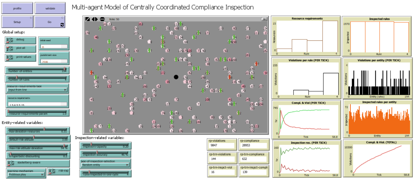 The central part of the interface graphically displays the current simulation step. Entities, the Inspection Agency and inspections are shown with different icons. At the beginning of the simulation (setup()), the given number of entities (number-of-entites) is randomly placed, each entity having a unique numeric mark. In each step of the simulation (go()), the inspections' icons are positioned on the selected entity and the inspection is performed. The color of the inspection (inspector) indicates whether the inspection in question has revealed compliance (green) or violation (red). The entity's color indicates how many rules it is violating (darker red indicates that the entity violates more rules). The current step (tick) is visible.