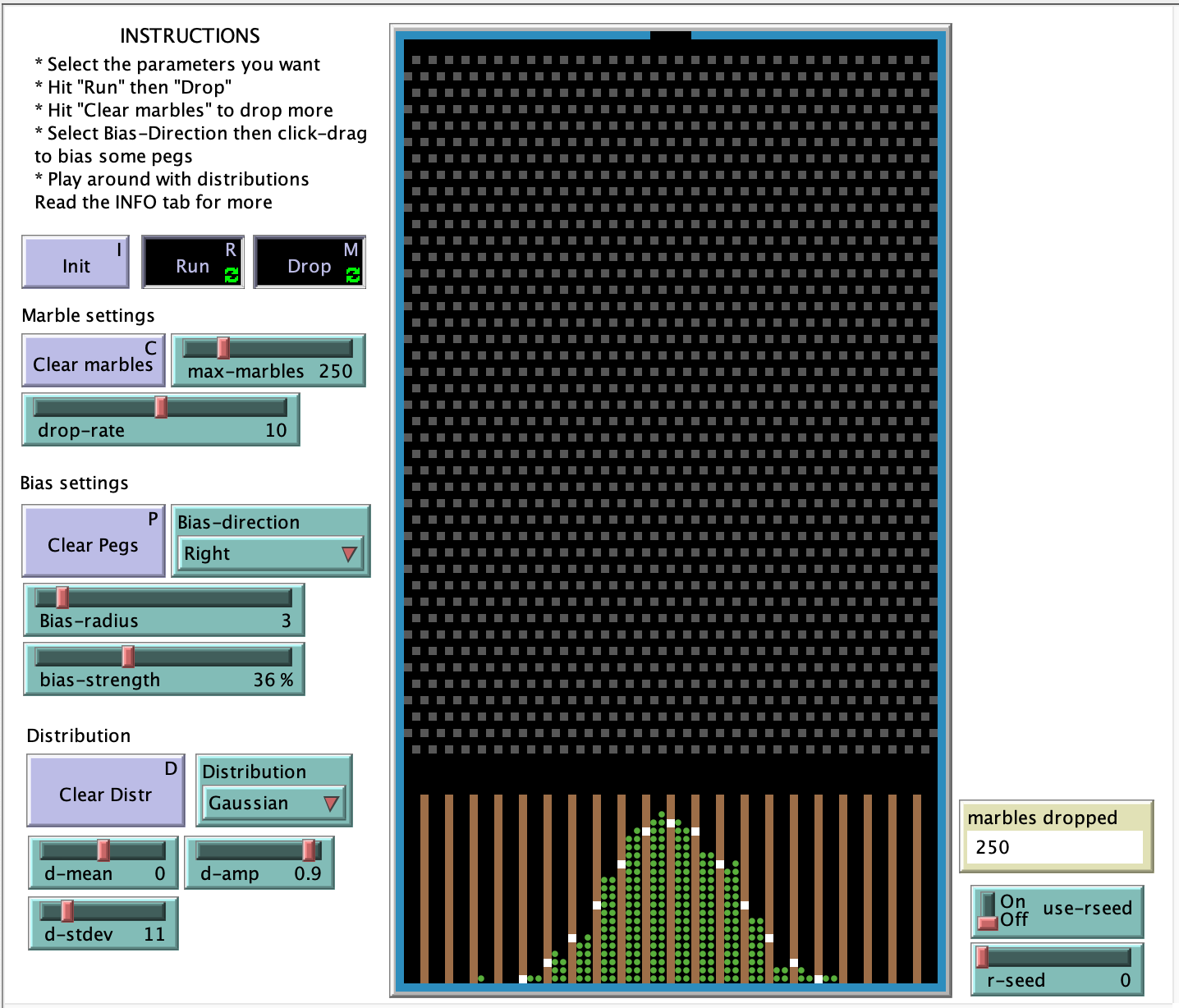 === Additional controls === - The toggle "use-rseed" determines whether at initialization the random number generator uses a seed or not. If you want to replicate a run, turn this ON and select a desired seed. - Use the "r-seed" slider to set a random number seed between 0 and 10 - The "# of marbles" box is a counter showing how many marbles have been dropped.