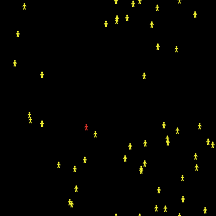 to setup clear-all create-turtles 50 [ setxy random-xcor random-ycor set shape "person" set color yellow ] ask one-of turtles [ set color red ] reset-ticks end to go ask turtles [ set heading random 360 forward 1 if any? other turtles-here with [color = red] [ set color red] ] tick end