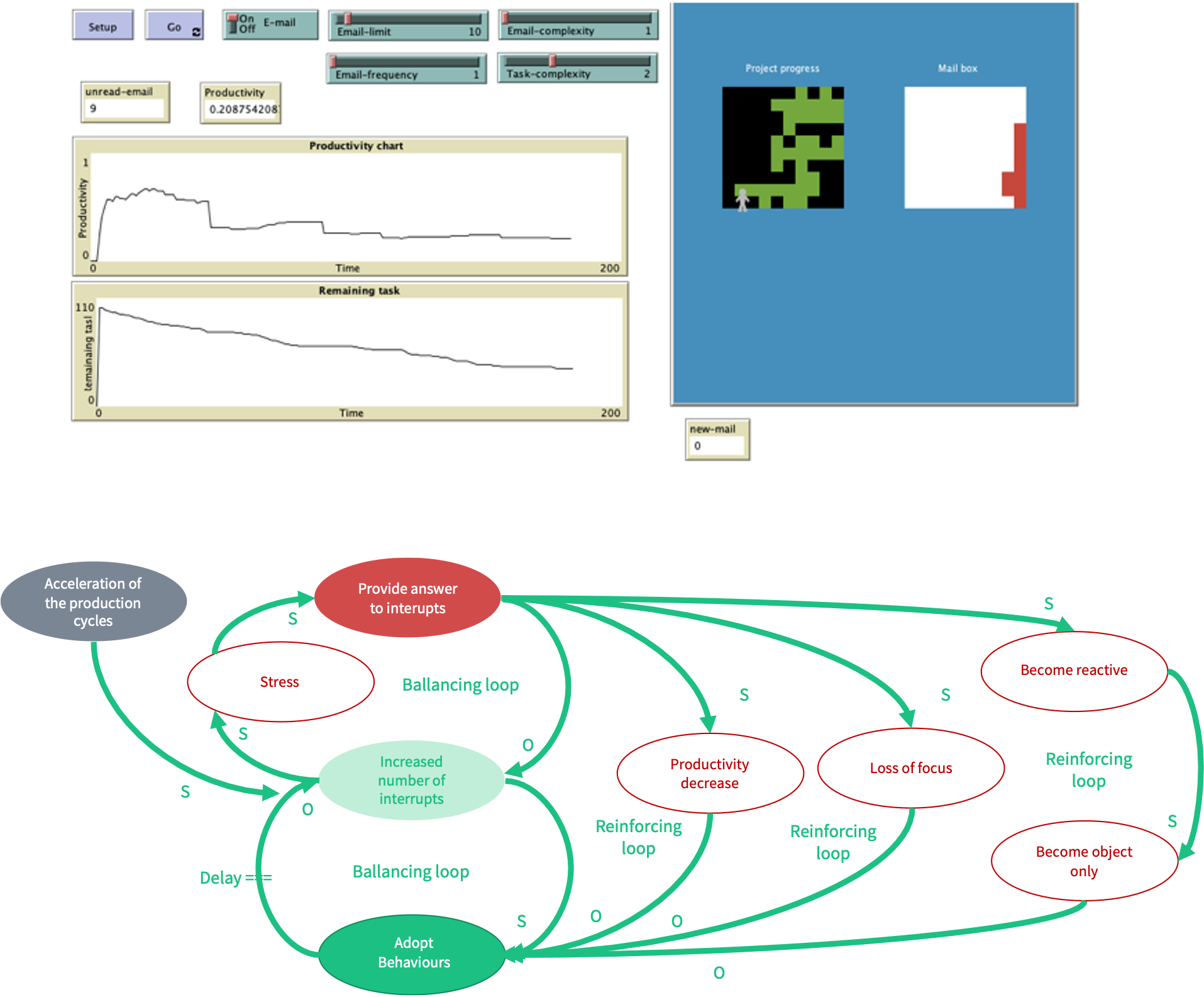 This model illustrates the influence of interrupts (represented in this model by e-mail to read and answer) on personal project productivity. It’s possible to simulate how the frequency to look into ones’ mailbox influences the productivity factoring a certain level of complexity in project tasks and e-mail.