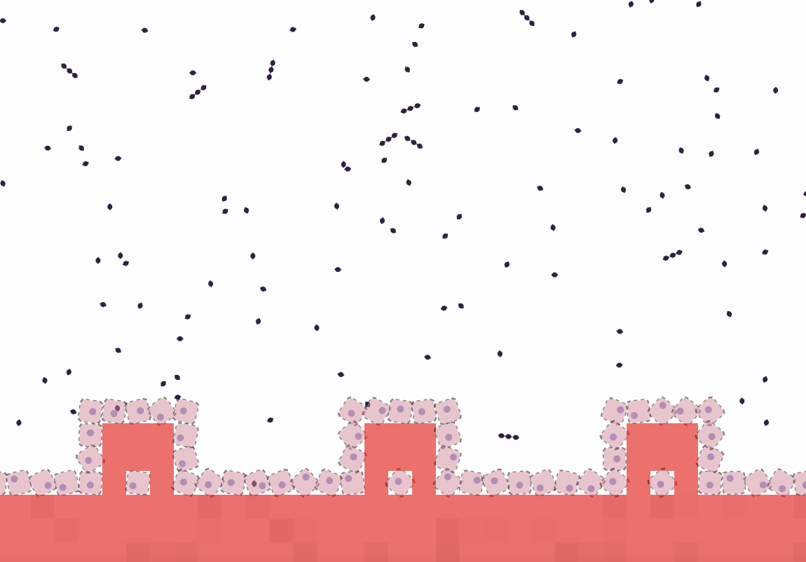 In this model, food particles tend to flow from right to left, representing the movement of molecules through the small intestine as if they are suspended in a liquid. Particles wander some too in that liquid. If a particle reaches the left or right side of the world, they appear on the other side (the world wraps from left to right).