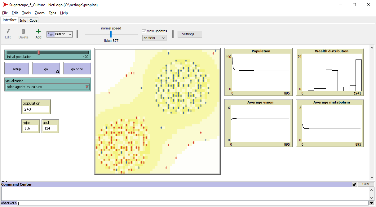 This model in the NetLogo Sugarscape suite implements Epstein & Axtell's Sugarscape Culture dynamics, as described in chapter 3 of their book Growing Artificial Societies: Social Science from the Bottom Up. It simulates a population with limited, spatially-distributed resources available and cultural tags distrbuted among population. Each tag could have a bollean value, 1 or 0. There are 2 differents cultural groups: reds and blues. Each cultural group is defined by the majority rule, more 1s lead to red, more 0s lead to blue. Each individual can pass a cultural tag to another one in their Moore neirghborhood.