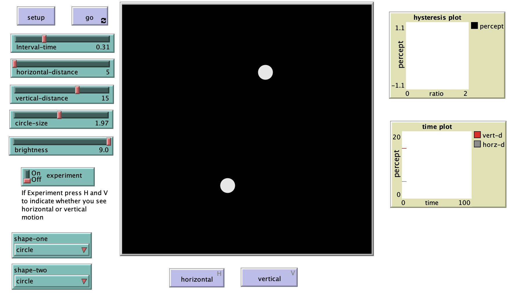With horizontal-distance and vertical-distance you can manipulate the aspect ratio. Interval-time controls the speed of the movement. When Experiment is on, the aspect ratio changes slowly. Press H and V to indicate whether you see horizontal or vertical motion. Other controls manipulate the stimuli.
