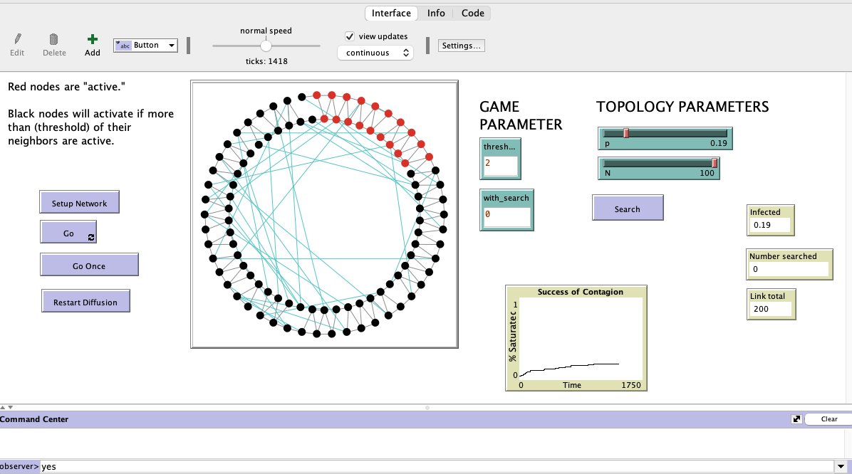 Create a network with P=0 (a lattice network) and THRESHOLD=2. Run the diffusion model a few times. Now, rewire just a few times, and try the diffusion model a few times. What happens?