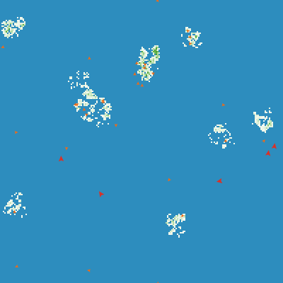 If a prey senses predator(s) within its vision, it will turn away from the nearest predator and move forward by vision / 3. If there are no predators and no food within a radius of 3, then the prey will school with other prey. If a predator senses prey within its vision, it will turn towards the nearest prey, move forward by vision / 2, and initiate an attack. Otherwise, predators will school with other predators for more efficient hunting. Predators can only attack every 15 ticks.