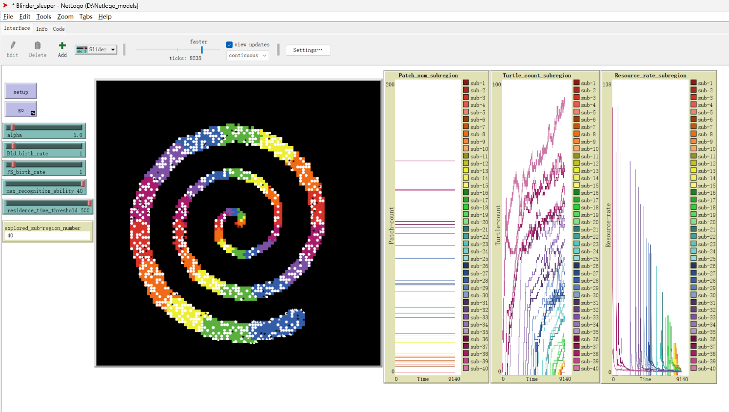 The overall environment for turtles to move is a spire-like cycles, as I described in the "model scope" section. So it is a type of spatial environment. The environment restricts the turtles to moving only within the path, which becomes increasingly narrower as they approach the center point.The pathway is divided into 40 sub-regions, with lower sub-region numbers indicating closer proximity to the center (e.g., sub-region #40 represents the outermost areas, while sub-region #1 represents the innermost). Each sub-region is distinguished by different colors, with colors from a specific angle to the center remaining approximately consistent, symbolizing how a particular (scientific) question can recur in the real world, yet continues to evolve with advancements in science and technology.