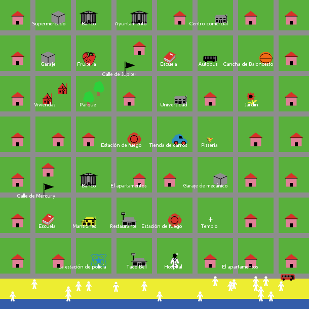 breed [people person] breed [labels label-turtle] breed [buses bus] turtles-own [ destination ] patches-own [ building-type is-road? ] to setup clear-all resize-world -30 30 -30 30 set-patch-size 10 setup-roads setup-buildings setup-labels setup-beach setup-people setup-bus reset-ticks end to setup-roads ask patches [ set pcolor green set is-road? false ] ;; Horizontal roads (every 8 rows) ask patches with [pycor mod 8 = 0] [ set pcolor gray set is-road? true ] ;; Vertical roads (every 8 columns) ask patches with [pxcor mod 8 = 0] [ set pcolor gray set is-road? true ] end to setup-buildings ;; North West Quadrant (x < 0, y > 0) draw-building -22 24 "Supermercado" "box" draw-building -30 24 "" "house" draw-building -30 16 "" "house" draw-building -30 8 "" "house" draw-building -30 0 "" "house" draw-building -22 0 "" "house" draw-building -16 0 "" "house" draw-building -24 16 "Garaje" "box" draw-building -16 24 "Banco" "bank" draw-building -8 14 "Calle de Jupiter" "flag" draw-building -16 8 "Parque" "tree" draw-building -8 8 "" "house" draw-building -14 10 "" "tree" draw-building -16 16 "Fruitería" "strawberry" draw-building -6 24 "Ayuntamiento" "government" draw-building -6 18 "" "house" draw-building -24 8 "Viviendas" "bungalo" draw-building -21 10 "" "bungalo" draw-building -7 0 "Estación de fuego" "fire" ;; North East Quadrant (x >= 0, y > 0) draw-building 10 24 "Centro comercial" "building" draw-building 2 8 "Universidad" "building" draw-building 8 16 "Autobus" "bus" draw-building 16 8 "Jardín" "flower" draw-building 24 8 "" "house" draw-building 8 8 "" "house" draw-building 17 0 "" "house" draw-building 25 0 "" "house" draw-building 19 16 "Cancha de Baloncesto" "basketball" draw-building 24 16 "" "house" draw-building 8 0 "Pizzería" "pizza" draw-building 0 16 "Escuela" "school" draw-building 2 24 "" "house" draw-building 16 24 "" "house" draw-building 24 24 "" "house" draw-building 2 0 "Tienda de carros" "car" ;; South East Quadrant (x >= 0, y <= 0) draw-building 10 -8 "Garaje de mecánico" "box" draw-building 1 -24 "Hospital" "person doctor" draw-building 16 -24 "El apartamentos" "house" draw-building 24 -24 "" "house" draw-building 24 -16 "" "house" draw-building 24 -8 "" "house" draw-building 8 -24 "" "house" draw-building 0 -8 "" "house" draw-building 1 -16 "Estación de fuego" "fire" draw-building 8 -16 "Templo" "temple" draw-building 16 -16 "" "house" draw-building 16 -8 "" "house" ;; South West Quadrant (x < 0, y <= 0) draw-building -16 -8 "Banco" "bank" draw-building -24 -6 "" "house" draw-building -30 -8 "" "house" draw-building -30 -16 "" "house" draw-building -30 -24 "" "house" draw-building -22 -24 "" "house" draw-building -8 -16 "Restaurante" "restaurant" draw-building -6 -24 "Taco Bell" "restaurant" draw-building -14 -24 "La estación de policía" "police" draw-building -24 -16 "Escuela" "school" draw-building -24 -10 "Calle de Mercury" "flag" ;; Placeholder road draw-building -16 -16 "Mansiones" "mansions" draw-building -6 -8 "El apartamentos" "house" end to draw-building [x y name building-shape] ask patches with [pxcor >= x and pxcor < x + 5 and pycor >= y and pycor < y + 5 and not is-road?] [ set pcolor green set building-type name ] create-labels 1 [ setxy x + 3 y + 3 set shape building-shape set label name set size 3 set color black set label-color white ] end to setup-labels ask labels [ set hidden? false ] end to setup-beach let beach-row min-pycor ask patches with [pycor = beach-row] [ set pcolor blue ] ask patches with [pycor = beach-row + 1] [ set pcolor blue ] ask patches with [pycor = beach-row + 2] [ set pcolor yellow ] ask patches with [pycor = beach-row + 3] [ set pcolor yellow ] ask patches with [pycor = beach-row + 4] [ set pcolor yellow ] ask patches with [pycor = beach-row + 5] [ set pcolor yellow ] end to setup-people create-people 20 [ let beach-patch one-of patches with [pcolor = yellow] if beach-patch != nobody [ setxy [pxcor] of beach-patch [pycor] of beach-patch ] set color white set shape "person" set size 2 set destination nobody ] end to setup-bus create-buses 2 [ ;; Create two buses let start-patch patch -24 -24 if start-patch != nobody [ setxy [pxcor] of start-patch [pycor] of start-patch set color red set shape "bus" set size 3 set heading 90 ] ] end to move-bus ask buses [ let next-patch patch-ahead 0.5 if next-patch != nobody and [is-road?] of next-patch [ fd 0.1 ] if next-patch = nobody or not [is-road?] of next-patch [ rt 90 ] ] end to go ask people [ if destination = nobody or distance destination < 1 [ let options patches with [building-type != "" and distance myself > 2] if any? options [ set destination one-of options ] ] if destination != nobody [ let target-x [pxcor] of destination let target-y [pycor] of destination let nearest-road min-one-of patches with [is-road?] [distancexy target-x target-y] if nearest-road != nobody [ face nearest-road rt random 10 - 5 ;; slight wobble let next-step patch-ahead 0.5 if next-step != nobody and [is-road?] of next-step [ fd 0.5 ] ] ] ] move-bus tick end