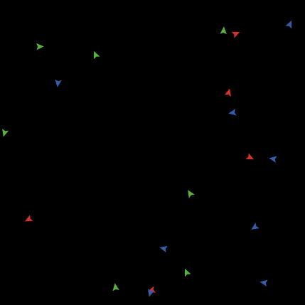 to setup ca crt 20 [ setxy random-xcor random-ycor set color one-of [ red green blue]] reset-ticks end to swap-colors [t1 t2] let temp [color] of t1 ask t1 [ set color [color] of t2 ] ask t2 [ set color temp ] end to go ask turtles [ let partner one-of (turtles in-radius 2) if partner != nobody [ swap-colors self partner ] rt random 30 - 15 fd .5 ] tick end