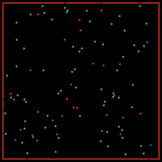 - If a particle finds itself on or very close to a wall of the container, it "bounces" --- that is, reflects its direction and keeps its same speed.