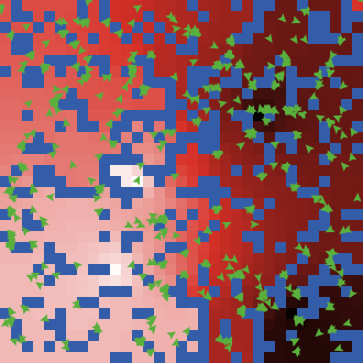 __includes [ "diffuse-in-bounds.nls" ; Same as diffuse but only for patches in bounds. "output-wrap.nls" ; Same as output-print but wraps printed output. "sigfigs.nls" ; Like precision but specifies number of significant figures. "random-walk.nls" ; Random walk. "updownhill-in-bounds.nls" ; Like uphill/downhill but only for patches in bounds. ] patches-own [ wall? source? sink? redness ] turtles-own [ age ] globals [ ; Variable 'dt' not needed here if using System Dynamics Modeler. dt ; Time step. Automatically set in 'go' by 'per-capita-tau-leap'. ] to startup setup ; Might as well setup when model loaded. end to setup clear-all reset-ticks output-wrap 27 ; Set output box to wrap at column 27. output-wrap ( word "Demonstrates hill climbing with bounds. Blue patches are walls that block " "movement. The red property diffuses within bounds and the turtles attempt to " "follow the gradient downhill (from white to black).\n\n" "Choose the wall-density and number of sources-and-sinks, then press 'setup'. " "Note that the edges also act as walls.\n" ) output-wrap ( word "Press 'go' to start diffusing and movement. The rate of diffusion is determined by " "the log-diffusion and err-tolerance sliders.\n" ) ask patches [ set source? false set sink? false set wall? random-float 1 < wall-density if-else wall? [ set pcolor blue ] [ set redness 5 ] ] ask n-of sources-and-sinks patches with [not wall?] [ set source? true set redness 10 ] ask n-of sources-and-sinks patches with [not wall? and not source?] [ set sink? true set redness 0 ] color-patches ask patches with [not wall? and not source? and not sink?] [ sprout 1 [ set size 1 set color green set age random world-width ] ] end to go if ticks = 0 [ output-wrap ( word "Green turtles move downhill (from white to black), avoiding blue walls " "until they get too old or reach a black sink. Then they respawn at a random " "new location and continue downhill. Some turtles get stuck trying to push " "through walls. Meanwhile, the red property diffuses from " "the white sources to the black sinks.\n" ) ] ; assume err = fraction = diffusion-const * dt set dt inaccuracy / diffusion-const ask patches with [source?] [ set redness 10 ] ask patches with [sink?] [ set redness 0 ] if-else (neighborhood = "4 neighbors") [ diffuse4-in-bounds "redness" inaccuracy task [not wall?] ] [ diffuse-in-bounds "redness" inaccuracy task [not wall?] ] color-patches ask turtles [ if-else (neighborhood = "4 neighbors") [ set heading towards-downhill4-in-bounds task [ redness ] task [ not wall?] ] [ set heading towards-downhill-in-bounds task [ redness ] task [ not wall?] ] set age age + dt if sink? or age > world-width ; don't let get older than it takes to cross fraction of world [ move-to one-of patches with [not wall?] set age 0 ] ] random-walk-in-cone-bounds turtles dt 180 * sqrt dt task [not wall?] tick-advance dt end to-report diffusion-const ; Used by 'go' in call to 'diffuse-individual'. report 10 ^ log-diffusion end to-report inaccuracy ; Complement of accuracy, depends on err-tolerance. ; Used by 'go' in call to 'per-capita-tau-leap'. report 10 ^ ( err-tolerance ) end to color-patches ask patches with [ wall? = false ] [ set pcolor scale-color red redness 0 10 ] end