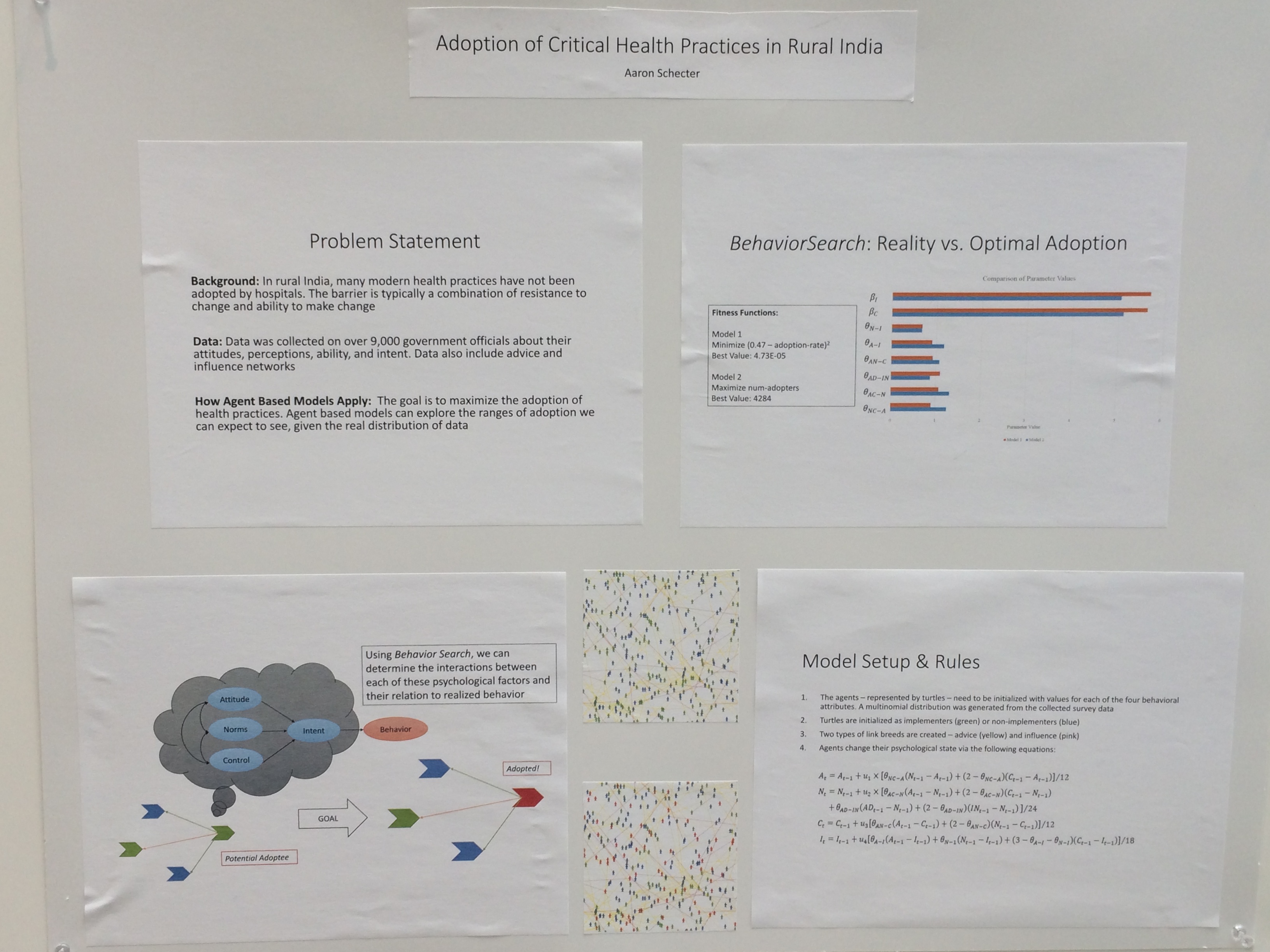 This is an agent based model meant to replicate the adoption of health practices by government officials in Bihar, India. The data built into the model is based on survey responses gathered in a large-scale data collection effort covering 9,799 individuals. Several psychological factors were tested, as well as demographic information and self-reported advice and influence networks.