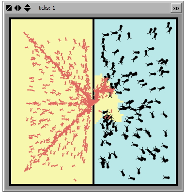 1: Notice the formation of the ant swarms as the battle lines are joined. 2: Every battle has a begin, middle and end game. See if you can predict which side wins when either one of the sides has hit the 80% anhilation mark. 3: See if the dominance of sqaure law or the linear law can be predicted based on the user settings. 4: Compare and contrast the model with the ant swarm activities one may have noticed in the wild. 5: Notice the marked difference in the body counts when the switch is flipped between single vs. multiple holes.