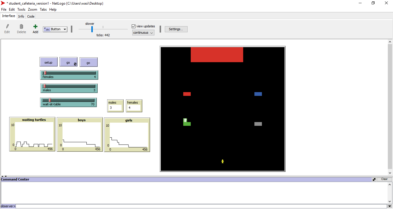 (First we created breeds of male and female students. Female students are represented by red color and male students are represented by blue color. Four tables are created at different location. student initially are present at the door and only from their they can enter. from that point they move straight forward between the tables. if the table in their left or right is empty they move to that table. Color of the turtle is changed to white showing the turtle as eating in the cafy.student stay on the table until random choosen time is completed. when time is completed the student is moved to out of the cafy at a specific point and color is changed to yellow. Number of male and female student is manage by sliders. waiting time for each student is also managed by slider. )