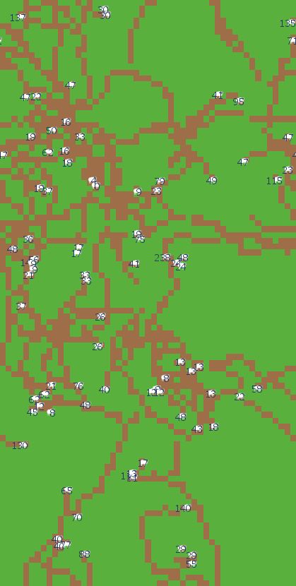 globals [ max-sheep ] ; don't let sheep population grow too large ; Sheep and wolves are both breeds of turtle. breed [ sheep a-sheep ] ; sheep is its own plural, so we use "a-sheep" as the singular. breed [ wolves wolf ] breed [ humans human ] turtles-own [ energy ] ; both wolves and sheep and humans have energy patches-own [ countdown ] to setup clear-all ifelse netlogo-web? [set max-sheep 10000] [set max-sheep 30000] ; Check model-version switch ; if we're not modeling grass, then the sheep don't need to eat to survive ; otherwise the grass's state of growth and growing logic need to be set up ifelse model-version = "humans-sheep-wolves-grass" [ ask patches [ set pcolor one-of [ green brown ] ifelse pcolor = green [ set countdown grass-regrowth-time ] [ set countdown random grass-regrowth-time ] ; initialize grass regrowth clocks randomly for brown patches ] ] [ ask patches [ set pcolor green ] ] create-sheep initial-number-sheep ; create the sheep, then initialize their variables [ set shape "sheep" set color white set size 1.5 ; easier to see set label-color blue - 2 set energy random (2 * sheep-gain-from-food) setxy random-xcor random-ycor ] create-wolves initial-number-wolves ; create the wolves, then initialize their variables [ set shape "wolf" set color black set size 2 ; easier to see set energy random (2 * wolf-gain-from-food) setxy random-xcor random-ycor ] create-humans initial-number-humans [ set shape "person" set color blue set size 2.5 set energy random (2 * human-gain-from-food) setxy random-xcor random-ycor ] display-labels reset-ticks end to go ; stop the simulation of no wolves or sheep if not any? turtles [ stop ] ; stop the model if there are no wolves and the number of sheep gets very large if not any? wolves and count sheep > max-sheep [ user-message "The sheep have inherited the earth" stop ] ask sheep [ move if model-version = "humans-sheep-wolves-grass" [ ; in this version, sheep eat grass, grass grows and it costs sheep energy to move set energy energy - 1 ; deduct energy for sheep only if running sheep-wolf-grass model version eat-grass ; sheep eat grass only if running sheep-wolf-grass model version death ; sheep die from starvation only if running sheep-wolf-grass model version ] reproduce-sheep ; sheep reproduce at random rate governed by slider ] ask wolves [ move set energy energy - 1 ; wolves lose energy as they move eat-sheep ; wolves eat a sheep on their patch death ; wolves die if our of energy reproduce-wolves ; wolves reproduce at random rate governed by slider ] ask humans [ move set energy energy - 1 eat-sheep eat-wolves death reproduce-humans ] if model-version = "humans-sheep-wolves-grass" [ ask patches [ grow-grass ] ] ; set grass count patches with [pcolor = green] tick display-labels end to move ; turtle procedure rt random 50 lt random 50 fd 1 end to eat-grass ; sheep procedure ; sheep eat grass, turn the patch brown if pcolor = green [ set pcolor brown set energy energy + sheep-gain-from-food ; sheep gain energy by eating ] end to reproduce-sheep ; sheep procedure if random-float 100 < sheep-reproduce [ ; throw "dice" to see if you will reproduce set energy (energy / 2) ; divide energy between parent and offspring hatch 1 [ rt random-float 360 fd 1 ] ; hatch an offspring and move it forward 1 step ] end to reproduce-wolves ; wolf procedure if random-float 100 < wolf-reproduce [ ; throw "dice" to see if you will reproduce set energy (energy / 2) ; divide energy between parent and offspring hatch 1 [ rt random-float 360 fd 1 ] ; hatch an offspring and move it forward 1 step ] end to reproduce-humans if random-float 100 < human-reproduce [ set energy (energy / 2) hatch 1 [ rt random-float 360 fd 1 ] ] end to eat-sheep ; wolf procedure let prey one-of sheep-here ; grab a random sheep if prey != nobody [ ; did we get one? if so, ask prey [ die ] ; kill it, and... set energy energy + wolf-gain-from-food ; get energy from eating ] end to eat-wolves let prey one-of wolves-here if prey != nobody [ ask prey [ die ] set energy energy + human-gain-from-food ] end to death ; turtle procedure (i.e. both wolf nd sheep procedure) ; when energy dips below zero, die if energy < 0 [ die ] end to grow-grass ; patch procedure ; countdown on brown patches: if reach 0, grow some grass if pcolor = brown [ ifelse countdown <= 0 [ set pcolor green set countdown grass-regrowth-time ] [ set countdown countdown - 1 ] ] end to-report grass ifelse model-version = "humans-sheep-wolves-grass" [ report patches with [pcolor = green] ] [ report 0 ] end to display-labels ask turtles [ set label "" ] if show-energy? [ ask wolves [ set label round energy ] if model-version = "humans-sheep-wolves-grass" [ ask sheep [ set label round energy ] ] ] end ; Copyright 1997 Uri Wilensky. ; See Info tab for full copyright and license.