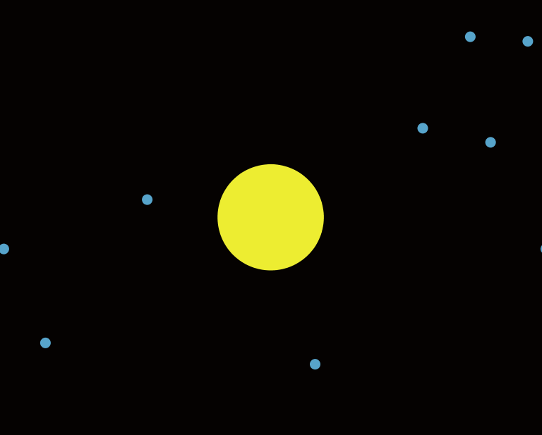 to setup ca set-default-shape turtles "circle" create-turtles 1 ask turtles [setxy 0 0 set size 10 set color 45] create-turtles 8 [setxy random-xcor random-ycor] ask turtles with [who > 0 ] [ set color 96 face turtle 0 ] ask patches[ set pcolor 10 ] reset-ticks end to go ask turtles with [who > 0 ] [ face turtle 0 rt 90 fd .1 ] tick end to kill-planets ask turtles with [who > 0 ][ die] tick end to endofuniverse ask turtles with [who > 0 ] [face turtle 0 fd .1 ] tick end to clear ca reset-ticks end to stars ask patches[ set pcolor black] ask n-of 15 patches [ set pcolor white] tick end to kill-stars ask patches [ set pcolor black ] tick end
