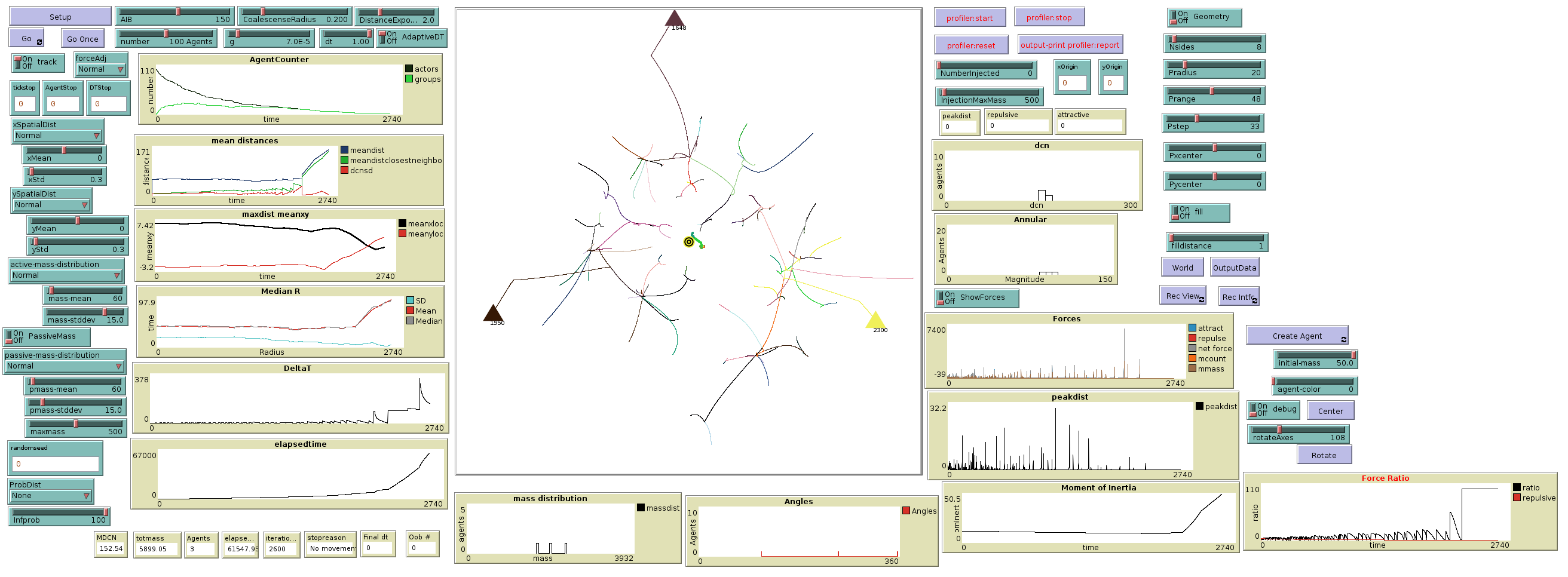 - totmass - at bottom of display, this monitor give the total mass of all agents in the simulation