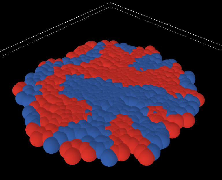 globals [x0 y0] patches-own [binding_0 binding_1 aff_0 aff_1 open? ideal_type] turtles-own [cell_type my_affinity] to Setup clear-all crt 2 [set cell_type 0 set shape "circle"] ask one-of turtles [fd 1 set cell_type 1] update-cells? ask patches [update-patches] set x0 0 set y0 0 reset-ticks end to Go mitosis migrate noisy-move space-out adhere set-center tick end to mitosis if ticks > division_time [ ask turtles [if count turtles < (2 ^ n_divisions) [hatch 1 [push-out cell-movement]]] reset-ticks] end to migrate ask n-of (noise * count patches) patches [set open? 1] ask turtles-on patches with [open? = 1] [ifelse cell_type = 0 [uphill aff_0 ask patch-here [update-patches] ask neighbors [update-patches]] [uphill aff_1 ask patch-here [update-patches] ask neighbors [update-patches]]] ;[cell-movement] end to noisy-move ask turtles [if random-float 1 < noise [face one-of neighbors fd random-float (1 + (100 * noise)) cell-movement]] end to space-out ask patches with [count turtles-here > 1.5] [ifelse ideal_type = 0 [ask turtles-here with [cell_type = 1] [face max-one-of neighbors [aff_1] fd 1 ask patch-here [update-patches] ask neighbors [update-patches]]] [ask turtles-here with [cell_type = 0] [face max-one-of neighbors [aff_0] fd 1 ask patch-here [update-patches] ask neighbors [update-patches]]] if count turtles-here > 1.5 [ask n-of (count turtles-here - 1) turtles-here [push-out] ]] end to adhere ask turtles [face patch x0 y0 ifelse any? turtles-on patch-ahead 1 [] [fd 1]] end to set-center if ticks > (division_time * 5) [ set x0 mean [xcor] of turtles set y0 mean [ycor] of turtles ] end to push-out carefully [face one-of neighbors with [open? = 1] fd 1 ask neighbors [update-patches]] [face min-one-of neighbors [count turtles-here] fd 1 ask neighbors [update-patches]] if count turtles-here > 1 [ carefully [ask min-one-of turtles-here [my_affinity] [face patch x0 y0 left 180 fd 1 cell-movement ask neighbors [update-patches]]] [] ] end to cell-movement ;; Turtle context only ifelse cell_type = 0 [set my_affinity [binding_0] of patch-here let da (max [aff_0] of neighbors) ifelse da > my_affinity [uphill aff_0 carefully [ask turtles-here [move-to max-one-of neighbors [aff_0]]] [face one-of patches jump 1 ask neighbors [update-patches]] ask neighbors [update-patches]] [face one-of patches fd random-float 1 ask neighbors [update-patches]] ask patch-here [if ideal_type = 0 [set open? 0]] ] [set my_affinity [binding_1] of patch-here let da (max [aff_1] of neighbors) ifelse da > my_affinity [uphill aff_1 carefully [ask turtles-here [move-to max-one-of neighbors [aff_1]]] [face one-of patches jump 1 ask neighbors [update-patches]] ask neighbors [update-patches]] [face one-of patches fd random-float 1 ask neighbors [update-patches]] ask patch-here [if ideal_type = 1 [set open? 0]] ] end to update-patches ;; Patch context only set binding_0 ((1 - (heterotypic)) * (count neighbors with [any? turtles-here with [cell_type = 0]])) + ((heterotypic) * (count neighbors with [any? turtles-here with [cell_type = 1]])) set binding_1 ((1 - (heterotypic)) * (count neighbors with [any? turtles-here with [cell_type = 1]])) + ((heterotypic) * (count neighbors with [any? turtles-here with [cell_type = 0]])) set open? 1 ifelse binding_0 > binding_1 [set ideal_type 0 if any? turtles-here with [cell_type = 0] [set open? 0]] [set ideal_type 1 if any? turtles-here with [cell_type = 1] [set open? 0]] set aff_0 (binding_0 * open?) set aff_1 (binding_1 * open?) end to update-cells? ask turtles [ifelse cell_type = 0 [set color red set color lput (opacity * 250) extract-rgb color] [set color blue set color lput (opacity * 250) extract-rgb color]] ask turtles [set size cell_size] end