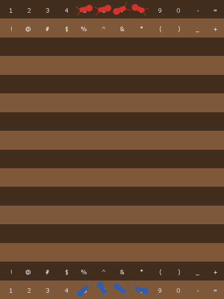 The Blue player should start, by choosing what bugs they want with the bottom buttons, paying attention to their costs. After a bug is chosen, use the middle buttons (or respective keys), to place the bugs on their tiles. The tiles have labels to match the buttons.