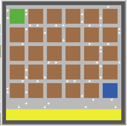 turtles-own [ energy goal picking packing dispatching charging turtles-present pending collected packaged dispatched laden? my-speed ] ;;;;;;;;;;;;;;;;;;;;;; ;; SETUP PROCEDURES ;; ;;;;;;;;;;;;;;;;;;;;;; to setup clear-all setup-patches ;; patches draw themselves __change-topology false false ;; square map, instead of torus, means agents cant wrap sides let picking-goal patches with [ ;; make agentset of patches where storage is connected to road pcolor = brown and any? neighbors with [ pcolor = gray + 2 ]] ;; patches that are brown, beside a road let packing-goal patches with ;; make agentset of patches where agents can pack [ pcolor = green and any? neighbors4 with [pcolor = gray + 2 ]] ;; patches that are yellow, beside a road let dispatching-goal patches with ;; make agentset of patches where agents can drop packages [ pcolor = blue and any? neighbors4 with [pcolor = gray + 2 ]] let charging-goal patches with ;; make agentset of patches where agents can charge [ pcolor = yellow and any? neighbors4 with [pcolor = gray + 2 ]] ;; patches that are yellow, beside a road ;; set location, direction, energy and color create-turtles num-turtles [ ;; initlialise n turtles move-to one-of patches with [ pcolor = gray + 2 ] ;; place on road separate set energy 300 set pending num-turtles ;; slider num set color white set picking one-of picking-goal ;; agent goal random storage set packing one-of packing-goal ;; agent goal random pack point set dispatching one-of dispatching-goal ;; agent goal random drop point set charging one-of charging-goal ;; choose random charge point set goal picking ;; agent goal is packing point ] reset-ticks end to setup-patches ;; build warehouse ask patches with [pycor < 15 and pycor > -10 and pxcor < 15 and pxcor > -15] [ set pcolor brown ] ;; STORAGE ask patches [ if pycor = 15 or pycor = -15 or pycor = 10 or pycor = -10 or pycor = 5 or pycor = -5 or pycor = 0 or pxcor = 15 or pxcor = -15 or pxcor = 10 or pxcor = -10 or pxcor = 5 or pxcor = -5 or pxcor = 0 [ set pcolor gray + 2 ] ;; ROAD if pycor > -15 and pycor < -10 [ set pcolor gray + 2 ] ;; ROAD if pxcor = 16 or pxcor = -16 or pycor = 16 or pycor = -16 [ set pcolor black + 3] ;; WALLS if pycor > -16 and pycor < -12 and pxcor > -16 and pxcor > -16 and pxcor < 16 [ set pcolor yellow ] ;; CHARGE STATION if pycor > 10 AND pycor < 15 AND pxcor > -15 AND pxcor < -10 [ set pcolor green ] ;; PACKING if pycor < -5 AND pycor > -10 AND pxcor < 15 AND pxcor > 10 [ set pcolor blue ] ;; DROP OFF ] end to separate ;; separate turtles if any? other turtles-here [ move-to one-of patches with [ pcolor = gray + 2 ]] ;; if collision, place elsewhere end ;;;;;;;;;;;;;;;;;;;;;;;; ;; RUNTIME PROCEDURES ;; ;;;;;;;;;;;;;;;;;;;;;;;; to go check-trail? check-goal? check-charge move tick end to check-trail? ;; agents draw their path ask turtles [ set turtles-present count turtles-here ifelse show-trail? [ pen-down ] [ pen-up ] ] end to check-goal? ;; agents display goal as label ask turtles [ set turtles-present count turtles-here ifelse show-goal? [ if goal = picking [ set label "picking" ] if goal = packing [ set label "packing" ] if goal = dispatching [ set label "dispatching" ] if goal = charging [ set label "charging" ] ] [ set label "" ] ] end to check-charge ask turtles [ ifelse energy < 100 and (goal = picking or goal = packing) ;; if charge below 100 and agent has cancelled pick or pack [ set goal charging set pending pending + 1 ] ;; charge and add order to pending again [ ifelse energy < 100 and (goal = dispatching) ;; if charge below 100 and cancelled dispatch [ set goal charging set packaged packaged - 1 set pending pending + 1 ] ;; charge and cancel packaged [ if energy < 100 [set goal charging set color orange]] ;; otherwise, charge ] ] end to move ask turtles [ face next-patch ;; face goal set-speed ;; move forward if possible ] end to reduce-speed fd -1 set my-speed 0 end to increase-speed fd 1 set my-speed 1 end to set-speed if energy > 505 [ fd 1 ] ;; fixes glitch where agents freeze occasionally after charging ifelse not member? patch-here [neighbors4] of charging [ ifelse any? turtles-on patch-ahead 1 ;; if path is blocked [ lt random 90 ;; incrementally turn ifelse [ pcolor ] of patch-ahead 1 != grey + 2 ;; if not facing path [ lt random 90 set color pink ] ;; incrementally turn and color pink when avoiding obstacle [ increase-speed update-energy ] ;; when path clear move and reduce charge ] [ increase-speed update-energy ] ] ;; move and reduce charge ] [ set heading 0 update-energy ;; face up if pcolor != yellow [ reduce-speed update-energy] ;; stay still and begin charging ] end to update-energy ifelse laden? = true ;; if carrying item, [ set energy energy - 2 ] ;; increase rate of energy consumption [ set energy energy - 1 ] ;; otherwise, normal rate if member? patch-here [neighbors] of charging [ set energy energy + 10 ] ;; increase turtle energy when on bay if pcolor = yellow and energy > 499 [ increase-speed set goal picking ] ;; if full charge leave bay end to-report next-patch ;; establish goal of agent if goal = picking [ set color white ] if goal = picking and (member? patch-here [ neighbors4 ] of picking) [ ;; if goal pick and order picked set goal packing ;; goal set to packing order set color green - 1 set pending pending - 1 set laden? true ;; carrying item ] if goal = packing [ set color green ] if goal = packing and (member? patch-here [ neighbors4 ] of packing) [ ;; if goal pack and order packed set goal dispatching ;; goal set to dispatching order set color blue - 1 set packaged packaged + 1 ] if goal = dispatching [ set color blue ] if goal = dispatching and (member? patch-here [ neighbors4 ] of dispatching) [ ;; if goal drop and order dropped set goal picking ;; goal set to next order set color white set dispatched dispatched + 1 set packaged packaged - 1 set pending pending + 1 set laden? false ;; not carrying item ] ;; CHOICES is agentset of the candidate patches that the robot can move to let cho