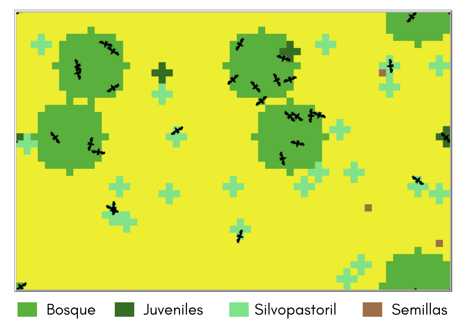 globals [ color_change_triggered ticksA ticksB ] turtles-own [ energia capacidad_volar tiempo_reproduccion ] patches-own [ Frutos Semillas Edad ] To Valor_Base set Frutos 10 set Semillas 50 set Edad 3 set capacidad_volar 5 set tiempo_reproduccion 20 end to setup resize-world 0 60 0 38;creamos el mundo clear-all ; Establecer el color amarillo para todas las parches en el mundo ask patches [set pcolor yellow] ; bosque ask n-of Numero-de-parches-de-bosque patches[ask patches in-radius 5[ set pcolor green]] ; silvopastoril ask n-of Numero-de-parches-de-silvopastoril patches[ask patches in-radius 1 [ set pcolor 67]] ; juvenil ask n-of 3 patches[ ask patches in-radius 1[ set pcolor 53]] ; Semillas ask n-of 3 patches [set pcolor 35] ;crear las tortugas create-turtles 30[ ; se establecieron las condiciones de los murcielagos INICIALES set shape "bat" ; Define la forma personalizada del murciélago set size 2 set color black setxy random xcor random ycor move-to one-of patches with [pcolor = green OR pcolor = 53 or pcolor = 67] set energia 40 set heading random 360 ] set color_change_triggered false set ticksA 0 set ticksB 0 reset-ticks end to iniciar ask turtles [if energia >= 10 and energia <= 30 [volar] if energia > 40 [ if ticks mod 10 = 0 [reproduc]] set heading random 360 fd 1 set energia energia - 2 morir ] ask turtles[if ticks mod 10 = 0 [dispersar]] ask turtles[alimentar] ;Restauración tasa baja if tasa-de-cooperacion > 20 and tasa-de-cooperacion < 50 [ if ticks mod 100 = 0 [ask patches with [pcolor = green] [ ask neighbors4 [ if pcolor != green [set pcolor green]]]]] ;Restauración tasa media if tasa-de-cooperacion >= 50 and tasa-de-cooperacion <= 80 [ if ticks mod 60 = 0 [ask patches with [pcolor = green] [ ask neighbors4 [ if pcolor != green [set pcolor green]]]]] ;restauración tasa alta if tasa-de-cooperacion >= 80 [ if ticks mod 40 = 0 [ask patches with [pcolor = green] [ ask neighbors4 [ if pcolor != green [set pcolor green]]]]] ;Deforestación if tasa-de-cooperacion <= 20 [ if ticks mod 10 = 0 [ask patches with [pcolor = yellow] [ ask neighbors4 [ if pcolor != yellow [set pcolor yellow]]]]] ; crecimeito de las semillas set ticksA ticksA + 1 if ticksA >= 20 [ ask patches with [pcolor = 35] [ ask patches in-radius 1 [ set pcolor 53]] set ticksA 0 ; Reiniciar el contador después de cambiar el color ] set ticksB ticksB + 1 if ticksB >= 30 [ ask patches with [pcolor = 53] [ ask patches in-radius 1 [ set pcolor green]] set ticksB 0 ; Reiniciar el contador después de cambiar el color ] set color_change_triggered true tick end to volar right (random 181) - 90 right (random 21) - 10 forward 1 ask turtles in-radius 5 [ ifelse (Semillas = 0 or Frutos = 0 or edad <= 1) [ ifelse any? patches with [ Semillas > 0 or Frutos > 0 or edad > 2 or pcolor = green or pcolor = 53 ] [ face one-of patches with [ pcolor = green or pcolor = 53 OR pcolor = 67] fd capacidad_volar set energia energia - 10 alimentar] [ set energia energia - 5]] [ alimentar]] end to alimentar ifelse pcolor = green or pcolor = 53 [ set energia energia + 30] [set energia energia - 3 ] end to descansar ifelse pcolor = green or pcolor = 53 [ set energia energia - 5] [set energia energia + 1] end to reproduc if energia > 80 [ if random 100 > 50 [set energia energia - 20 hatch 1 [ rt random-float 360 fd 2 set energia energia - 2]]] end to morir if energia < 1 [die] if count turtles = 150 [ ask n-of 30 turtles [die]] end to dispersar if energia > 10 and pcolor = yellow [ ask patch-here [set pcolor 35]] set energia energia - 20 end