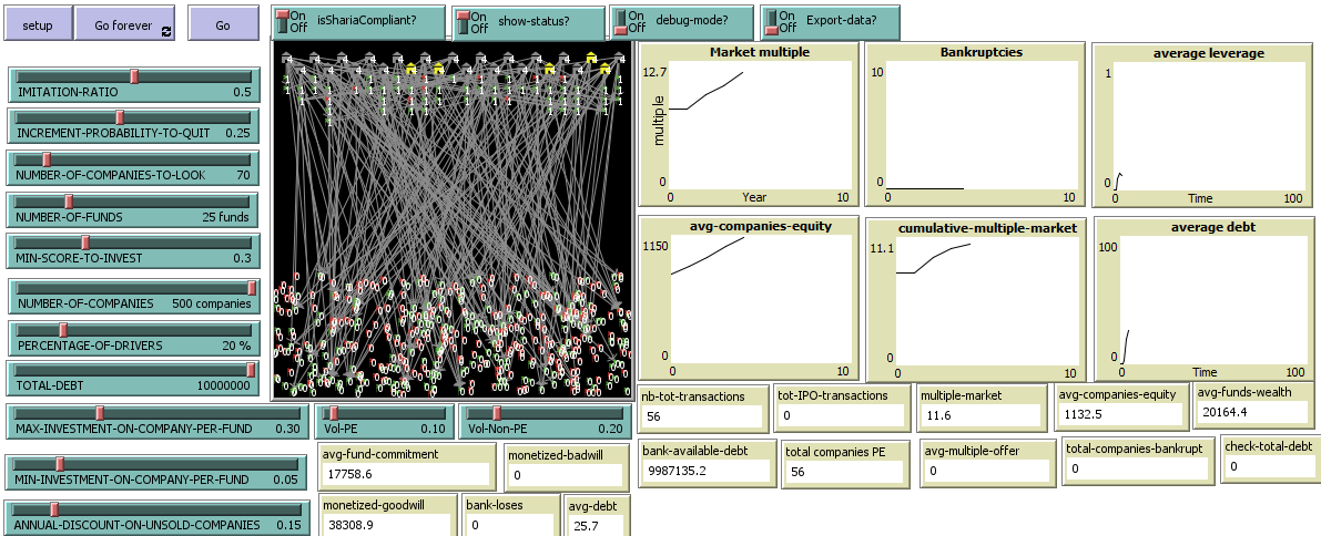 ; import native netlogo library to use tables and array extensions [table array] ; define global variables globals [ ; Global fix variables (hypothesis of simulation) COMPANIES-MAX-LEVERAGE ; companies max leverage set at 0,9 for non sharia compliant companies and 0,33 for sharia compliant companies MIN-DEBT-RATIO ; companies min debt ratio set at 0 for sharia compliant companies and 0,6 for non sharia compliant for optimization purposes AUCTION-RISE-PERCENT; ; pourcentage of price rise for each round in the auction process ; Global variables for companies avg-companies-ebit avg-companies-equity std-dev-companies-equity avg-companies-leverage tot-companies-bankrupt avg-companies-multiple-offer ; average multiple offer while companies are bought by funds min-companies-debt avg-companies-debt tot-companies-debt tot-companies-PE ; total of private equity backed companies tot-companies-monetized-badwill tot-companies-monetized-goodwill ; monetized badwill and goodwill while companies are bought by funds ; Global variables for funds avg-funds-wealth avg-fund-commitment number-of-funds-drivers ; a fund is considered driver if other funds imitate his investments ; Global variables for market data tot-IPO-transactions tot-transactions nb-transactions-per-tick ; informations of transactions multiple-market next-multiple-market cumulative-multiple-market next-cumulative-multiple-market ; information of multiple market created-market-wealth ; created wealth for the global market ; Global counter variables company-counter fund-counter ; Global bank variables bank-available-debt bank-loses ] ; companies and funds are both breeds of turtle. breed [companies company] breed [funds fund] companies-own [id-company ebit ebit-growth cash ebit-growth-n-1 enterprise-value debt debt-rate status debt-reimbursment age-on-status initial-investment multiple-offer fund-owner-id ownership-percent] ;status 0,1,2,3 -> normal, PEbacked, bankrupt,forsale ; multiple-offer is the last multiple offer used funds-own[id-fund age available-commitment investments wealth max-investment-on-company min-investment-on-company isDriver] ; setup functions to setup clear-all setup-globals-variables setup-companies setup-funds calculate-avg-tot reset-ticks end to setup-company [id-c] ask companies with [id-company = id-c] [ set shape "flag" set color white set size .8 setxy random-xcor (random-ycor / 3 - 2 * max-pycor / 3) set company-counter company-counter + 1 set status 0 set age-on-status 0 set ebit 100 set ebit-growth 0 set debt 0 set enterprise-value 800 set debt-rate 0.05 set debt-reimbursment 0 set cash enterprise-value * 2 / 3 ; each company has initial value of 800 set initial-investment 0 set ownership-percent 0.66 set multiple-offer 0 set fund-owner-id 0 ] end to setup-companies create-companies NUMBER-OF-COMPANIES; initial-number-companies ; create the companies, then initialize their variables [ set id-company company-counter setup-company id-company ] end to setup-funds create-funds NUMBER-OF-FUNDS; initial-number-companies ; create the companies, then initialize their variables [ set id-fund fund-counter set shape "house" set color gray set size 1.2 setxy (min-pxcor + (fund-counter - .5) * (max-pxcor - min-pxcor) / NUMBER-OF-FUNDS) (max-pycor - 1) if (fund-counter mod 2 = 0) [set ycor ycor - 1] set fund-counter fund-counter + 1 ] ask funds [ set isDriver 0 set available-commitment 20000 set age 0 set max-investment-on-company MAX-INVESTMENT-ON-COMPANY-PER-FUND * available-commitment set min-investment-on-company MIN-INVESTMENT-ON-COMPANY-PER-FUND * available-commitment set investments [] set wealth available-commitment ] ask n-of NUMBER-OF-FUNDS-DRIVERS funds [ set isDriver 1 set color yellow ] end to setup-globals-variables set multiple-market 8 ; is set at 8 as initial value set next-multiple-market 0 set next-multiple-market 0 set created-market-wealth 0 set cumulative-multiple-market multiple-market set company-counter 1 set fund-counter 1 set nb-transactions-per-tick 0 set tot-transactions 0 set tot-companies-bankrupt 0 set bank-available-debt TOTAL-DEBT ; bank available debt is set to total debt as initial value ; initial fix values set AUCTION-RISE-PERCENT 0.1 set MIN-DEBT-RATIO 0.6 set COMPANIES-MAX-LEVERAGE 0.9 if isShariaCompliant? [ set MIN-DEBT-RATIO 0 set COMPANIES-MAX-LEVERAGE 0.33] ;Min 1 et x% of number of funds set number-of-funds-drivers int (PERCENTAGE-OF-DRIVERS / 100 * NUMBER-OF-FUNDS) if number-of-funds-drivers = 0 [set number-of-funds-drivers 1] end ; run functions to initialize-tick set next-multiple-market 0 set nb-transactions-per-tick 0 end ; calculate funds wealth to calculate-funds-wealth ; fund wealth = available commitement (cash available) + value of each owned company (equity value of the company * owned percent) ask funds [ ;calculate fund wealth set wealth available-commitment foreach investments [ id-c -> let m-status item 0 [status] of companies with [id-company = id-c ] if m-status != 2 [ let m-value item 0 [enterprise-value] of companies with [id-company = id-c ] let m-debt item 0 [debt] of companies with [id-company = id-c ] let m-ownership-percent item 0 [ownership-percent] of companies with [id-company = id-c ] set wealth wealth + (m-value - m-debt ) * m-ownership-percent ] ] set max-investment-on-company MAX-INVESTMENT-ON-COMPANY-PER-FUND * wealth set min-investment-on-company MIN-INVESTMENT-ON-COMPANY-PER-FUND * wealth ] end ; calculate multiple market to calculate-multiple-market if nb-transactions-per-tick > 0 [set multiple-market next-multiple-market / nb-transactions-per-tick ] if tot-transactions > 0 [ set cumulative-multiple-market next-cumulative-multiple-market / tot-transactions ] end ; calculate companies performance to calculate-companies-performance ask companies with [status != 2] [ ;calculate ebit set ebit-growth-n-1 ebit-growth ; different growth for private equity backet company ifelse (status = 1 or status = 3) ; Private equity backed company [ set ebit-growth