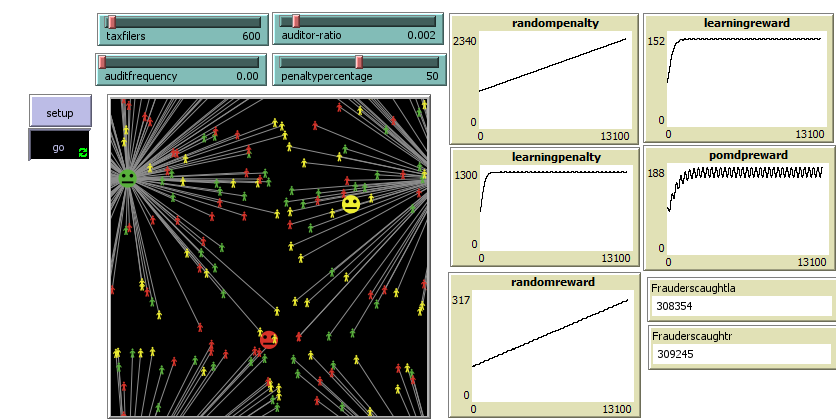 breed [randomauditors randomauditor ] breed [learningauditors learningauditor] globals [totalfrauders Frauderscaughtla Frauderscaughtr] breed[pomdpauditors pomdpauditor] breed [randomfilers randomfiler] breed [learningfilers learningfiler] breed [pomdpfilers pomdpfiler] randomauditors-own [ frauders collect ] learningauditors-own [ frauders collect ] pomdpauditors-own [ frauders collect] randomfilers-own [selected compliance taxdue reward] learningfilers-own [selected compliance taxdue reward] pomdpfilers-own [selected compliance taxdue observe belief reward] to setup clear-all reset-ticks set totalfrauders 0 create-randomauditors 1[setxy random-xcor random-ycor set color green set shape "face neutral" set size 2 set collect 0] create-learningauditors 1[setxy random-xcor random-ycor set color yellow set shape "face neutral" set size 2 set collect 0 ] create-pomdpauditors 1[setxy random-xcor random-ycor set color red set shape "face neutral" set size 2 set collect 0 ] create-randomfilers 50[setxy random-xcor random-ycor set color green set shape "person" set selected false set compliance random 3 set taxdue random-normal 1000 100 ] create-learningfilers 50[setxy random-xcor random-ycor set color yellow set shape "person" set selected false set compliance random 3 set taxdue random-normal 1000 100] create-pomdpfilers 50[setxy random-xcor random-ycor set color red set shape "person" set selected false set compliance random 3 set taxdue random-normal 1000 100 set observe true set belief 0.5] end to go takeaction set Frauderscaughtla Frauderscaughtla + random 50 set Frauderscaughtr Frauderscaughtr + random 50 audit tick end to audit ask randomauditors [ let rs one-of turtles with [breed = randomfilers or breed = learningfilers or breed = pomdpfilers ] create-link-with rs ask rs [set selected true] ] end to learn end to updatebelief ask pomdpfilers [ ifelse (observe = true) [ let a count turtles with [selected = true and compliance = 0] let b count turtles with [selected = true and compliance = 1] let o 2 * a + b ] [ ]] end to takeaction ask randomfilers [set compliance random 3] ask learningfilers [] ask pomdpfilers [ ifelse (belief > 0.85) [set compliance 2 ] [ ifelse (belief > 0.65) [set compliance 1] [ ifelse (belief > 0.35) [set observe true] [set compliance 1] ] ]] end to rewardb ask turtles with [breed = randomfilers or breed = learningfilers or breed = pomdpfilers] [ if (selected = true) [ if ( compliance = 0) [ ] if (compliance = 1) [] if (compliance = 2) [] ] ] end ;; rate tax ;; consommateur ;; complexité ;; auditeur intelligent (data mining) ;;training with big data