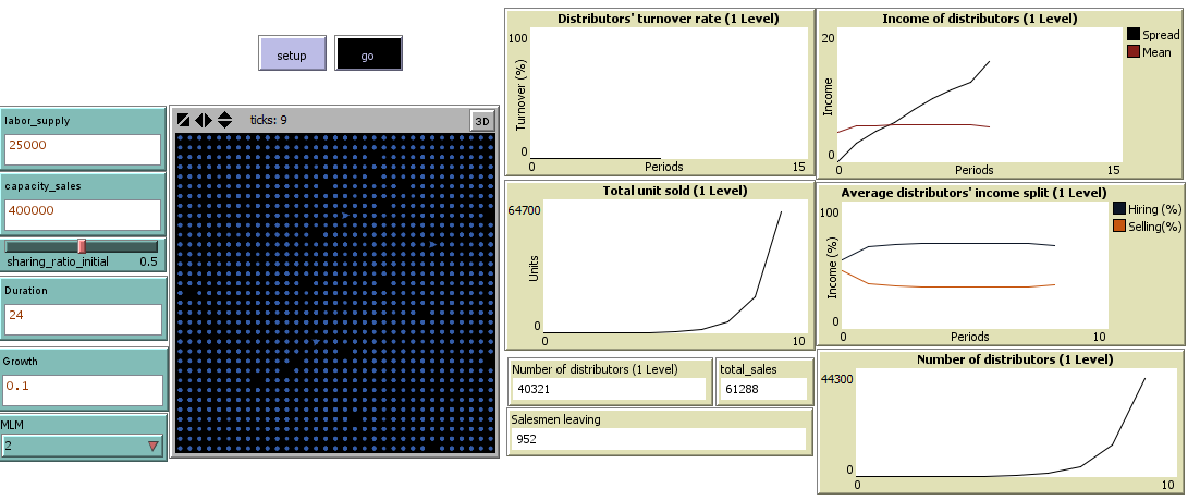 extensions [matrix] Globals [capacity_hiring total_sales Sales Hiring com_sales com_hiring direct_com_sales direct_com_hiring indirect_com_sales indirect_com_hiring hiring_rate sales_rate i j k temp_nb_ante temp_level temp_period alpha ante gini-index-reserve lorenz-points temp turnover missed_sales nb_agents_lag] breed [agts agt] agts-own [perf_sales perf_hiring new nb_ante sharing_ratio level period agent_sales agent_hiring agent_dircom_sales agent_indcom_sales agent_dircom_hiring agent_indcom_hiring income agent_sales_acc agent_dircom_sales_acc agent_dircom_hiring_acc agent_indcom_sales_acc agent_indcom_hiring_acc income_acc agent_hiring_acc] To setup clear-all reset-ticks set capacity_hiring labor_supply let nb 400000 set sales matrix:make-constant nb 30 0 set hiring matrix:make-constant nb 30 0 set direct_com_hiring matrix:make-constant nb 30 0 set direct_com_sales matrix:make-constant nb 30 0 set indirect_com_sales matrix:make-constant nb 30 0 set indirect_com_hiring matrix:make-constant nb 30 0 set ante matrix:make-constant nb 30 0 if MLM = 1 [ set hiring_rate matrix:from-column-list [[1.2 0 0 0 0 0 0 0 0 0 0 0 0]] ;; 1 level set sales_rate matrix:from-column-list [[0.6 0 0 0 0 0 0 0 0 0 0 0 0 0 0 0 0 0 0 0 0 0 0 0 0 0]] ;; 1 level ] if MLM = 2 [ set hiring_rate matrix:from-column-list [[1.2 0 0 0 0 0 0 0 0 0 0 0 0]] ;; 1 level set sales_rate matrix:from-column-list [[0.4 0.2 0 0 0 0 0 0 0 0 0 0 0 0 0 0 0 0 0 0 0 0 0 0 0 0]] ;; 1 level ] if MLM = 3 [ set hiring_rate matrix:from-column-list [[1.2 0 0 0 0 0 0 0 0 0 0 0 0]] ;; 1 levels set sales_rate matrix:from-column-list [[0.3 0.2 0.1 0 0 0 0 0 0 0 0 0 0 0 0 0 0 0 0 0 0 0 0 0 0 0]] ;; 3 levels ] if MLM = 6 [ set hiring_rate matrix:from-column-list [[1.2 0 0 0 0 0 0 0 0 0 0 0 0]] ;; 1 levels set sales_rate matrix:from-column-list [[0.24 0.17 0.08 0.05 0.04 0.02 0 0 0 0 0 0 0 0 0 0 0 0 0 0 0 0 0 0 0 0]] ;; 6 levels ] ;;update-lorenz-and-gini end To go while [ ticks <= duration] [ ifelse ticks = 0 ;; 1st period [ create-agts 1 ;; creates the first agent [ setxy random-pxcor random-pycor Set nb_ante 0 Set level 1 Set period 1 set alpha who + 1 ;;set sharing_ratio random-float 1 ;; part of the effort allocated to sales set sharing_ratio sharing_ratio_initial set agent_sales round (sharing_ratio * 10) ;; 10 number of sold items set agent_hiring round ((1 - sharing_ratio) * 4) ;; 4 number of hired salesmen maximum set temp agent_hiring ;; temp variable set agent_hiring_acc agent_hiring set agent_sales_acc agent_sales set agent_dircom_sales agent_sales * (matrix:get Sales_rate 0 0) set agent_dircom_hiring agent_hiring * (matrix:get hiring_rate 0 0) set agent_dircom_sales_acc agent_sales * (matrix:get Sales_rate 0 0) set agent_dircom_hiring_acc agent_hiring * (matrix:get hiring_rate 0 0) set income agent_dircom_sales + agent_dircom_hiring set income_acc income_acc + income set total_sales agent_sales set new 0 ;;set color white ;;set shape "dot" ;;Hide-turtle matrix:set sales alpha 0 agent_sales matrix:set hiring alpha 0 agent_hiring matrix:set direct_com_sales alpha 0 ((matrix:get Sales alpha 0) * (matrix:get Sales_rate 0 0)) matrix:set direct_com_hiring alpha 0 ((matrix:get hiring alpha 0) * (matrix:get hiring_rate 0 0)) ] create-agts temp ;; creates the sons of the first agent [ setxy random-pxcor random-pycor Set nb_ante 1 Set level 2 Set period 2 matrix:set ante (who + 1) 0 alpha set new 1 ;; for the first time activities allocation is random Hide-turtle ;;set color white ;;set shape "dot" ] ] [ ;; ticks > 0 set total_sales 0 set turnover 0 set nb_agents_lag count agts Leave let G random-float growth set capacity_hiring capacity_hiring + labor_supply * (1 + G) ^ (ticks - 1) * G - Turnover ;;set capacity_hiring capacity_hiring + growth - Turnover ask agts [ set k 0 set agent_sales 0 set agent_hiring 0 set income 0 set agent_dircom_sales 0 set agent_indcom_sales 0 set agent_dircom_hiring 0 set agent_indcom_hiring 0 set temp_level level set temp_period period set temp_nb_ante nb_ante set alpha who + 1 ifelse new = 1 ;; if new agent then random allocation [ set sharing_ratio sharing_ratio_initial set new 0 ] [ set sharing_ratio 1 - ( 1 / (perf_sales + 1 - min list perf_sales perf_hiring) / (( 1 / (perf_sales + 1 - min list perf_sales perf_hiring)) + ( 1 / (perf_hiring + 1 - min list perf_sales perf_hiring)))) ] ifelse total_sales <= capacity_sales ;; haven't reached market saturation yet (from a sales perspective) [ set agent_sales round (sharing_ratio * 10) set total_sales total_sales + agent_sales set agent_sales_acc agent_sales_acc + agent_sales matrix:set sales alpha ticks agent_sales ] [ ;; market saturation (from a sales perspective) _ first in / first served logic set agent_sales 0 set total_sales total_sales + agent_sales matrix:set sales alpha ticks agent_sales set agent_sales_acc agent_sales_acc + agent_sales ] ifelse count (agts) <= capacity_hiring ;; it is intersting for a salesman to join the MLM company [ set agent_hiring round ((1 - sharing_ratio) * 4) ;; 4 is the max hiring per period matrix:set hiring alpha ticks agent_hiring set agent_hiring_acc agent_hiring_acc + agent_hiring ] [ ;; it is not intersting to join the MLM company matrix:set hiring alpha ticks 0 ;;set agent_hiring_acc agent_hiring_acc + 0 set agent_hiring 0 ] matrix:set direct_com_sales alpha ticks ((matrix:get Sales alpha ticks) * (0.5 * 2 * matrix:get Sales_rate 0 0)) matrix:set direct_com_hiring alpha ticks ((matrix:get hiring alpha ticks) * (matrix:get hiring_rate 0 0)) set agent_dircom_sales_acc agent_dircom_sales_acc + (matrix:get sales alpha ticks) * (0.5 * 2 * matrix:get Sales_rate 0 0) set agent_dircom_hiring_acc agent_dircom_hiring_acc + (matrix:get hiring alpha ticks) * (matrix:get hiring_rate 0 0) set agent_dircom_sales ( (matrix:get sales alpha ticks) * (0.5 * 2 * matrix:get Sales_rate 0 0)) set agent_dircom_hiring ( (matrix:get hiring alpha ticks) * (matrix:get hiring_rate 0 0)) set income_acc income_acc + agent_dircom_sales + agent_dircom_hir