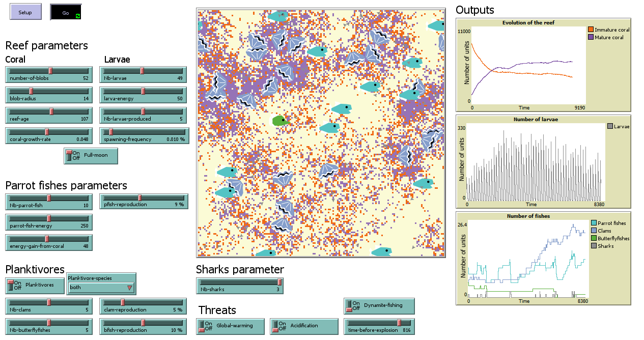 There are a multitude of threats affecting coral reefs, but this model covers only three: global warming, acidification, and dynamite fishing. The user can activate or deactivate each threat.