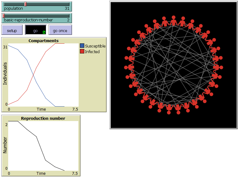 extensions [array] globals [reproduction-number old-infected new-infected] breed [individuals individual] individuals-own [ state ;; my current state: "INFECTED", or "SUSCEPTIBLE" marked? ;; whether I'm currently marked ] to setup clear-all ;; set up the model make-turtles set reproduction-number basic-reproduction-number set new-infected 1 recolor reset-ticks end ;; create all the turtles, place them, and associate forks with individuals to make-turtles set-default-shape individuals "person torso" ;; create-ordered-equally spaces the headings of the turtles, ;; in who number order create-ordered-individuals population [ set size 0.1 jump 0.35 set state "SUSCEPTIBLE" set marked? false ] ask individual 0 [set state "INFECTED"] end to go if new-infected > 0 [ a-go ] end to a-go set old-infected (old-infected + new-infected) clear-links ask individuals [ infect ] set new-infected 0 ask individuals [ update ] ifelse old-infected = 0 [ set reproduction-number 0 ] [ set reproduction-number (new-infected / old-infected) ] recolor tick end ;; everybody gets a new color. to recolor ask individuals [ ;; look up the color in the colors list indexed by our current state ifelse state = "SUSCEPTIBLE" [ set color blue ] [ set color red ] ] end ;; to infect ;; individual procedure if state = "INFECTED" [ ;; create an array of random numbers let values array:from-list shuffle range (population - 1) let index 0 repeat basic-reproduction-number [ let i2 array:item values index let i3 ((i2 + 1 + who) mod population) ask individual i3 [set marked? true] create-link-with individual i3 set index (index + 1) ] ] end ;; to update ;; individual procedure if marked? and state = "SUSCEPTIBLE" [ set state "INFECTED" set new-infected (new-infected + 1) ] set marked? false end ; Copyright 2025 Zebedee Mason. ; See Info tab for full copyright and license.