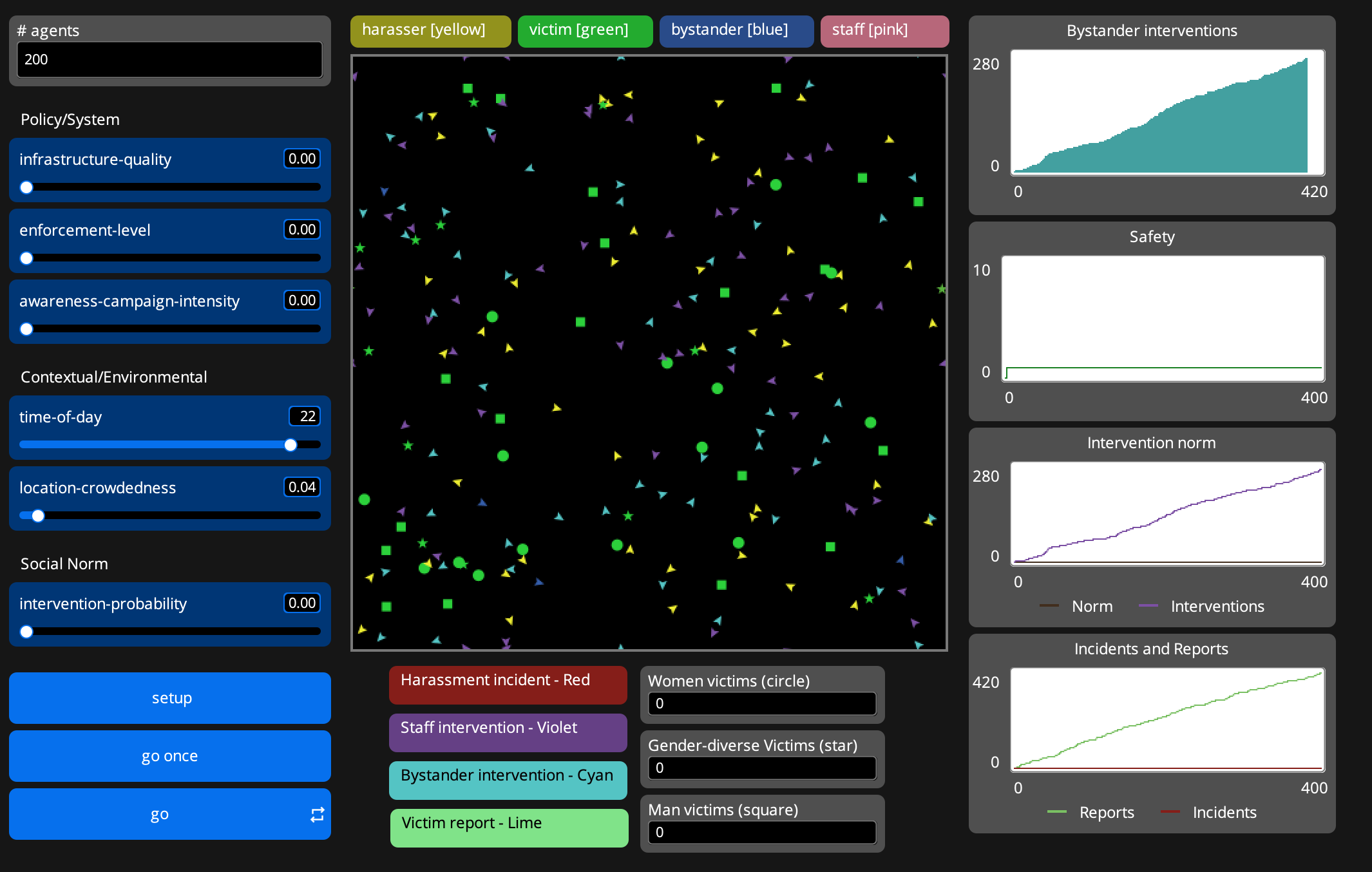 Click GO Agents move, interact and make decisions. Harassment events, reporting, intervention and movement all update the system.